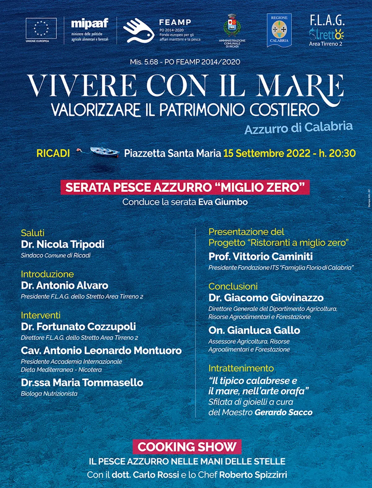 Continuano le iniziative e gli eventi del Flag dello Stretto Tirreno 2, dopo la tappa di Villa San Giovanni, giovedì 15 settembre alle ore 20:30, il Flag sarà in piazzetta Santa Maria a Ricadi, con l’evento “Vivere con il mare, valorizzare il patrimonio costiero”, iniziativa collegata ad “Azzurro di Calabria”. Una kermesse voluta dal sindaco di Ricadi, Nicola Tripodi e dal presidente del Flag, Antonio Alvaro. Questa iniziativa è a sostegno della categoria dei ristoratori e dei pescatori locali, che più di tutti hanno subito gli effetti negativi della pandemia e del Covid-19. Attività sostenuta dall’assessorato alle politiche agricole della Regione Calabria e dall’assessore Gianluca Gallo, con il coordinamento del direttore generale Giacomo Giovinazzo, che saranno presenti alla tappa di Ricadi. Con questa attività si vuole mettere in relazione i pescatori con gli imprenditori della ristorazione, per incentivare un maggior consumo del pesce povero, quello azzurro. Il Flag dello Stretto avvia una iniziativa che promuove e premia, mettendoli in rete, i ristoranti che si impegnano a trattare il pesce azzurro a “miglio zero”.