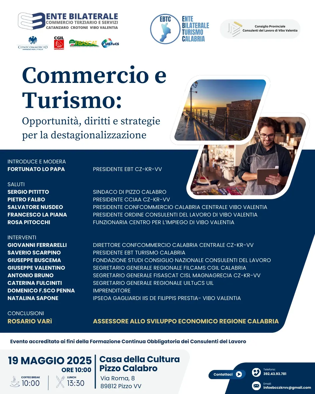 L’evento, promosso congiuntamente dall’Ente bilaterale del commercio, terziario e servizi e dall’Ente bilaterale turismo Calabria, in collaborazione con il Consiglio provinciale dell’Ordine dei consulenti del lavoro di Vibo Valentia, si preannuncia come un importante momento di confronto e di elaborazione di proposte concrete per affrontare una sfida cruciale per il territorio. All’incontro prenderanno parte figure di spicco del panorama istituzionale ed economico regionale.