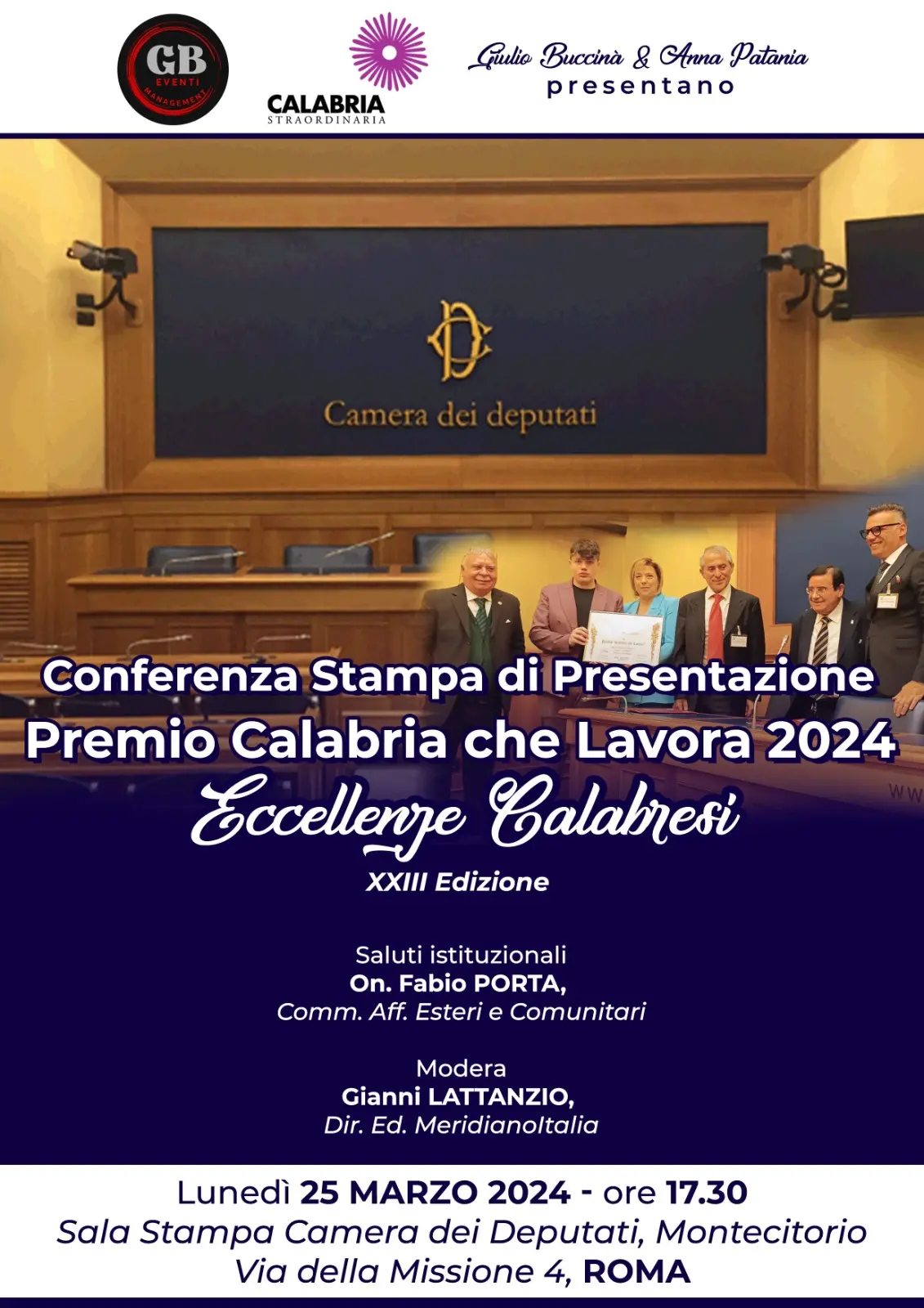 Si terrà lunedì 25 marzo alle ore 17,30 presso sala stampa camera dei deputati Montecitorio a Roma la 23esima edizione del premio più ambito internazionale per i calabresi nel mondo. Si tratta del riconoscimento “Premio Calabria che lavora”. L’evento mira a valorizzare le eccellenze calabresi e viene promosso da Asso Calabria, rappresentata dalla presidente Anna Patania e dal figlio Giulio Buccinà. Tra gli ospiti figurano, il maestro orafo Michele Affidato e professionalità di ogni settore. I saluti istituzionali saranno curati da Fabio Porta, della Commissione Affari esteri e comunitari. L’appuntamento è moderato dal Gianni Lattanzio, direttore Ed. MeridianoItalia.