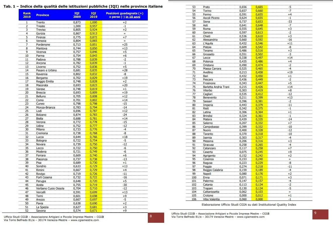 Si trovano in tre città del nord Italia, ovvero Trento, Trieste e Treviso, le istituzioni pubbliche più virtuose. Maglia nera Caltanissetta, Crotone (105esimo posto) e Vibo Valentia (106esimo posto). A certificarlo è l’Ufficio studi della Cgia di Mestre. Agli ultimi posti anche le altre calabresi: Catanzaro 92esima, Cosenza 95esima e Reggio Calabria 98esima. Più nel dettaglio, «l’Institutional quality index (Iqi) è un indice che misura la qualità delle istituzioni pubbliche presenti in tutte le realtà territoriali italiane. È stato concepito nel 2014 dall’Università degli Studi di Napoli Federico II. Questo misuratore assume un valore che va da 0 a 1; a differenza di altri che si basano sulle percezioni dei cittadini, quello redatto dai docenti napoletani fa riferimento a dati oggettivi e considera i servizi pubblici, l’attività economica territoriale, la giustizia, la corruzione, il livello culturale e la partecipazione dei cittadini alla vita pubblica». Recentemente è stato aggiornato: «Il risultato che emerge dall’applicazione di questo parametro – si fa rilevare – ci consegna un Paese spaccato a metà; se i livelli di eccellenza più elevati della nostra Pa a livello territoriale si concentrano prevalentemente al Nord, quelli più modesti, invece, si trovano al Sud. La realtà territoriale più virtuosa d’Italia è Trento, con indice IQI 2019 pari a 1; rispetto a dieci anni prima la provincia trentina ha recuperato due posizioni a livello nazionale. Seguono al secondo posto Trieste e al terzo Treviso. Appena fuori dal podio si trovano Gorizia, Firenze, Venezia, Pordenone, Mantova, Vicenza e Parma. Insomma, nei primi dieci posti, ben 8otto province appartengono alla macro area del Nordest. In coda troviamo Catania, Trapani, Caltanissetta, Crotone e Vibo Valentia che occupa l’ultima posizione».