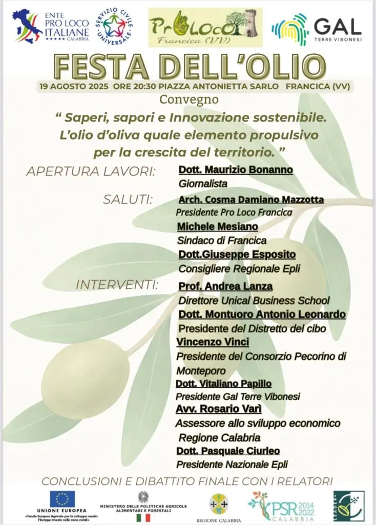 La comunità di Francica si prepara a ospitare un evento di grande rilevanza per il territorio e per il settore agricolo locale. Questa sera alle ore 20:30, in piazza Antonietta Sarlo, si terrà la “Festa dell’Olio”, un convegno dedicato a “Saperi, sapori e innovazione sostenibile. L’olio d’oliva quale elemento propulsivo per la crescita del territorio”. L’iniziativa organizzata dalla Pro Loco Francica in collaborazione con diverse istituzioni locali e regionali, vuole mettere in luce il ruolo cruciale che l’olio d’oliva riveste non solo come prodotto agricolo d’eccellenza, ma anche come motore di sviluppo economico e culturale per l’intera area. Il programma della serata prevede un’apertura dei lavori a cura del giornalista Maurizio Bonanno, che introdurrà un dibattito ricco di interventi di alto profilo. I saluti istituzionali saranno affidati all’architetto Cosma Damiano Mazzotta, presidente della Pro Loco Francica, e al sindaco di Francica, Michele Mesiano.
