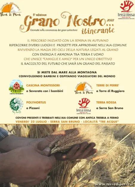 L’evento è promosso da “Terre di Perré – Custodi di Saperi e Sapori”, progetto dell’associazione culturale “I Sognatori” in collaborazione con l’azienda agricola “Terra rossa” che ospiterà la manifestazione. “Grano nostro” prevede anche il contributo dei progetti “Poly Hortus” e “Passpartout.up”. Parteciperanno trenta educatori ambientali provenienti da Spagna, Portogallo, Grecia, Romania e Italia coinvolti nel corso di formazione “Greener Life” che si tiene a Serra San Bruno dal 20 al 27 luglio nell’ambito della programmazione europea “Erasmus Plus”. Proseguono invece le collaborazioni storiche con la società agricola “Terra & Vita” dei fratelli Maio, l’associazione socio-culturale “Brognaturo nel cuore”, la cooperativa sociale “Solutions” e la cooperativa sociale “Risposta”.