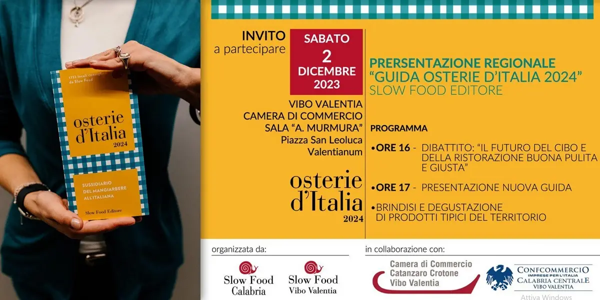 Sessanta insegne del cibo buono, pulito e giusto, tredici chiocciole e ben 6 novità. Sono i numeri della Calabria nella guida Osterie d’Italia 2024, di Slow Food Editore, che sarà presentata a Vibo Valentia sabato 2 dicembre alle ore 16 nella sala “Murmura” della Camera di Commercio, alla presenza del curatore nazionale Eugenio Signoroni, del presidente di Slow Food Calabria, Michelangelo D’Ambrosio, del coordinatore