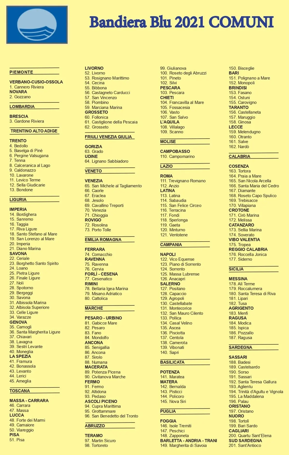Aumentano a 201, quest’anno, le località rivierasche (dalle 195 del 2020) che assieme a 81 porti turistici (erano 75 l’anno scorso) potranno fregiarsi della Bandiera Blu 2021, il riconoscimento della Fee.