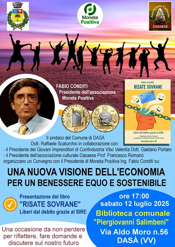 E ancora: «Il Pil, il profitto e la rendita finanziaria devono tornare ad essere dei semplici strumenti per realizzare il Benessere delle persone e migliorare la qualità della vita di tutti. Per realizzare questi obiettivi, servono nuovi strumenti di valutazione e soprattutto nuovi strumenti di finanziamento dell’economia reale, ma non devono più generare debito verso l’esterno, perché altrimenti l’Italia subirà sempre i ricatti dei mercati finanziari. La nostra Costituzione, nel pieno rispetto dei Trattai Europei, permette di realizzare nuovi strumenti innovativi e tecnologici. In questo modo possiamo finanziare una crescita economica strutturale senza aumentare il debito pubblico verso i mercati finanziari o l’Unione Europea e possiamo anche generare finalmente un benessere equo e sostenibile per tutti». Di tutto questo si parlerà nel convegno di sabato a Dasà, nel corso del quale sono previsti gli interventi del sindaco Raffaele Scaturchio e del presidente di Giovani imprenditori di Confindustria Vibo Gaetano Portaro.