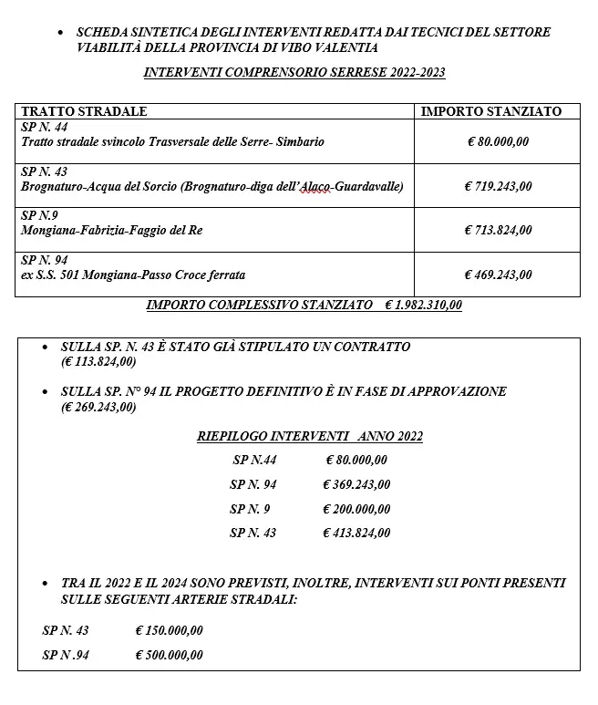 Continua senza sosta, «ai fini del miglioramento della viabilità stradale», l’attività amministrativa del presidente della Provincia di Vibo Valentia, Salvatore Solano. Diversi sono al riguardo i finanziamenti stanziati e, quindi, gli interventi programmati e in procinto di essere avviati (vedasi scheda allegata). «Una pianificazione che ha tenuto e sta tenendo in debita considerazione le indicazioni pervenute dagli amministratori locali, con i quali – ha evidenziato il presidente Solano – vi è una continua interlocuzione». Interlocuzione che si è intensificata negli ultimi mesi e che, ieri mattina, ha registrato un «proficuo appuntamento di incontro e di confronto», a Brognaturo, tra Solano e diversi sindaci e amministratori del territorio montano. [Continua in basso]