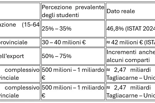 Oltre alla sottostima del valore aggiunto provinciale, anche il tasso di occupazione e le performance dell'export locale sono risultati percepiti dai ragazzi come decisamente inferiori rispetto ai numeri reali. Un quadro che restituisce l'immagine di un territorio più vitale di quanto i suoi stessi giovani immaginino.