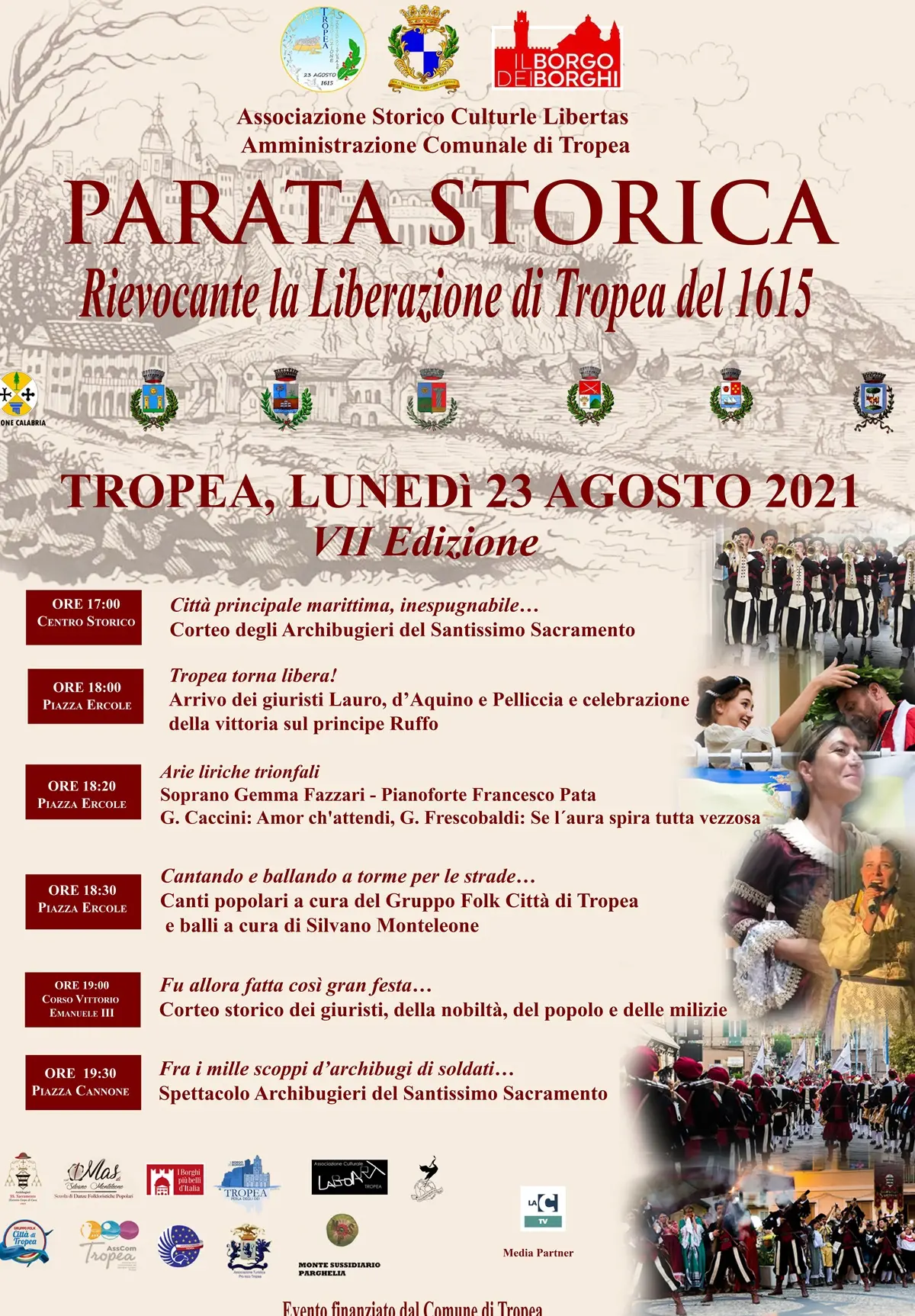 Nel pomeriggio di lunedì 23 agosto, a partire dalle ore 17, il gruppo degli Archibugieri del Santissimo Sacramento di Cava dei Tirreni sfilerà per le vie del centro storico, nel contempo dai balconi dei palazzi patrizi di Piazza Ercole i figuranti in costume d’epoca del ‘600 rievocheranno come in un quadro barocco la Tropea dell’epoca. Alle ore 18 inizierà la grande celebrazione con l’arrivo del corteo dei giuristi Lauro, d’Aquino e Pelliccia e la proclamazione dell’annullamento della vendita della città. Il soprano Gemma Fazzari intonerà arie liriche trionfali dell’epoca e il gruppo folk Città di Tropea dopo l’esecuzione di canti popolari diletterà il pubblico in danze coreografiche insieme alla scuola di danza folkloristica di Silvano Monteleone. Alle 19, invece, il grande corteo storico risalirà corso Vittorio Emanuele III per poi giungere in Piazza Cannone dove gli Archibugieri daranno vita allo spettacolo magistrale che chiuderà i festeggiamenti. L’evento sarà patrocinato dalla Regione Calabria e dai comuni dove un tempo ricadevano i casali di Tropea (Parghelia, Zambrone, Zaccanopoli, Drapia, Spilinga e Ricadi).