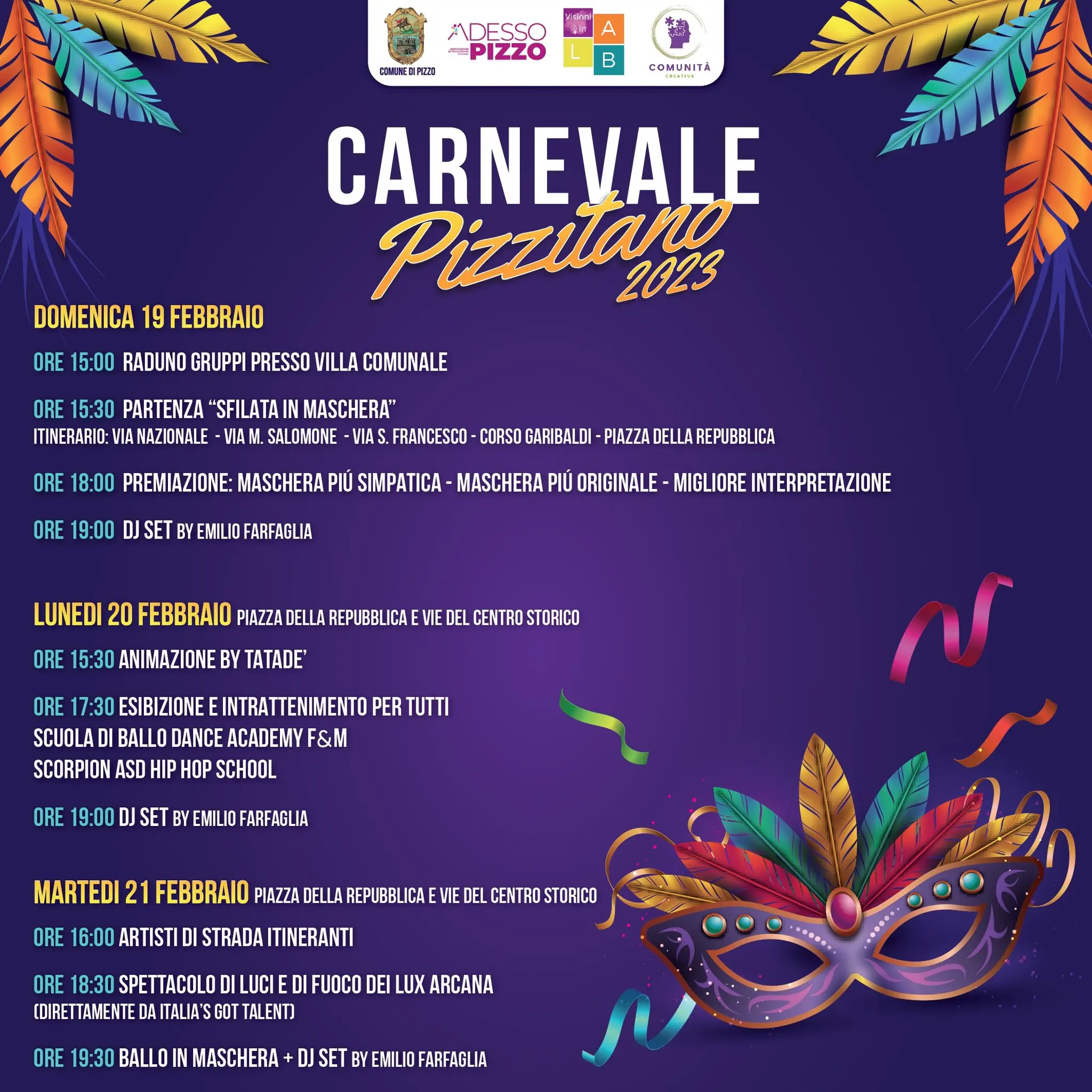Tutto pronto per il Carnevale Pizzitano, dalle maschere allegoriche alle feste in costume, sarà l’occasione per vivere tre giorni all’insegna del divertimento per grandi e piccini. La manifestazione organizzata dal Comune di Pizzo, con il supporto delle associazioni locali, “Adesso Pizzo” e “Visioni in Lab”, insieme al comitato “Comunità Creativa”, ha visto convogliare in un’unica forza fantasia, impegno e divertimento, realizzando un programma ricco e “colorato”, che si articolerà nelle giornate di domenica 19, lunedì 20 e martedì 21 febbraio. Si comincerà domenica con la sfilata in maschera, che vedrà la partecipazione di venti gruppi in maschera e più di trecento figuranti, per poi concludersi in Piazza della Repubblica con la premiazione e tanta musica. La festa proseguirà nei due giorni a seguire con intrattenimento musicale e danzate, artisti di strada e spazi dedicati alle attività laboratoriali dei bambini. Show finale martedì pomeriggio con il ballo in maschera, dj set e l’esibizione dei Lux Arcana, famoso gruppo proveniente direttamente da Italia’s Got Talent.