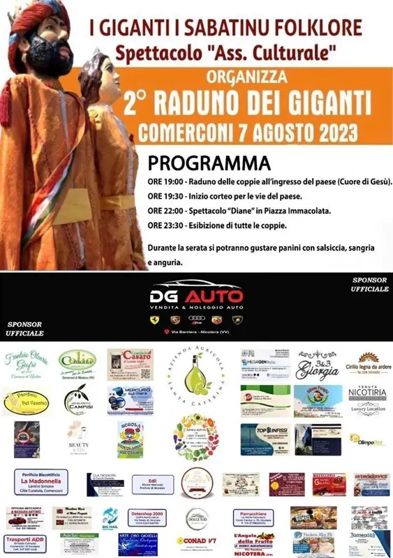 Dopo il successo dell’anno scorso, tutto pronto per il bis: a Comerconi, frazione collinare del comune di Nicotera, lunedì 7 agosto torna il raduno dei Giganti. Musica, tradizione e folklore si incontreranno per dar vita ad una serata speciale, tanto attesa soprattutto dai più piccoli. Saranno sedici le coppie di Mata e Grifone partecipanti, provenienti da diversi paesi del Vibonese e anche del Reggino: le vicine Nicotera e Limbadi, Coccorino, Vena Media, Maierato, Piana Pugliese e ancora Melicucco, Rosarno, Taurianova. L’evento è organizzato dall’associazione culturale “I Giganti di Sabatinu” di Comerconi, che, presieduta da Gabriele Piserà e formata da un gruppo di giovanissimi, da qualche anno porta in diversi paesi della Calabria il tradizionale ballo dei Giganti.