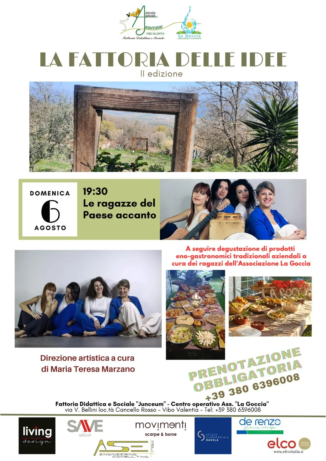 “Le Ragazze del paese accanto” si esibiranno alla Fattoria Didattica Junceum, questa sera alle ore 19.30 e a seguire ci sarà una degustazione enogastronomica a cura dei volontari dell’associazione “La Goccia”. “Questo giovane ensemble corale, proveniente da Crotone, – fanno sapere gli organizzatori – incanterà con un repertorio eclettico e affascinante, composto da canti in lingua portoghese, spagnola, georgiana, sanscrita e calabrese. Sarà un vero e proprio viaggio attraverso le sonorità di diverse culture e tradizioni. Le voci angeliche de “Le Ragazze del paese accanto” regaleranno emozioni intense e faranno immergere il pubblico in un’atmosfera magica. I loro canti, eseguiti con passione e maestria, porteranno i presenti in un mondo di melodie incantevoli e armonie sorprendenti. performance uniche che rappresentano un’occasione che farà viaggiare con la mente e con il cuore. Un grande progetto di vita che associazione e fattoria con altri partner portano avanti ormai da oltre 10 anni nella nostra comunità a favore dei più fragili“.