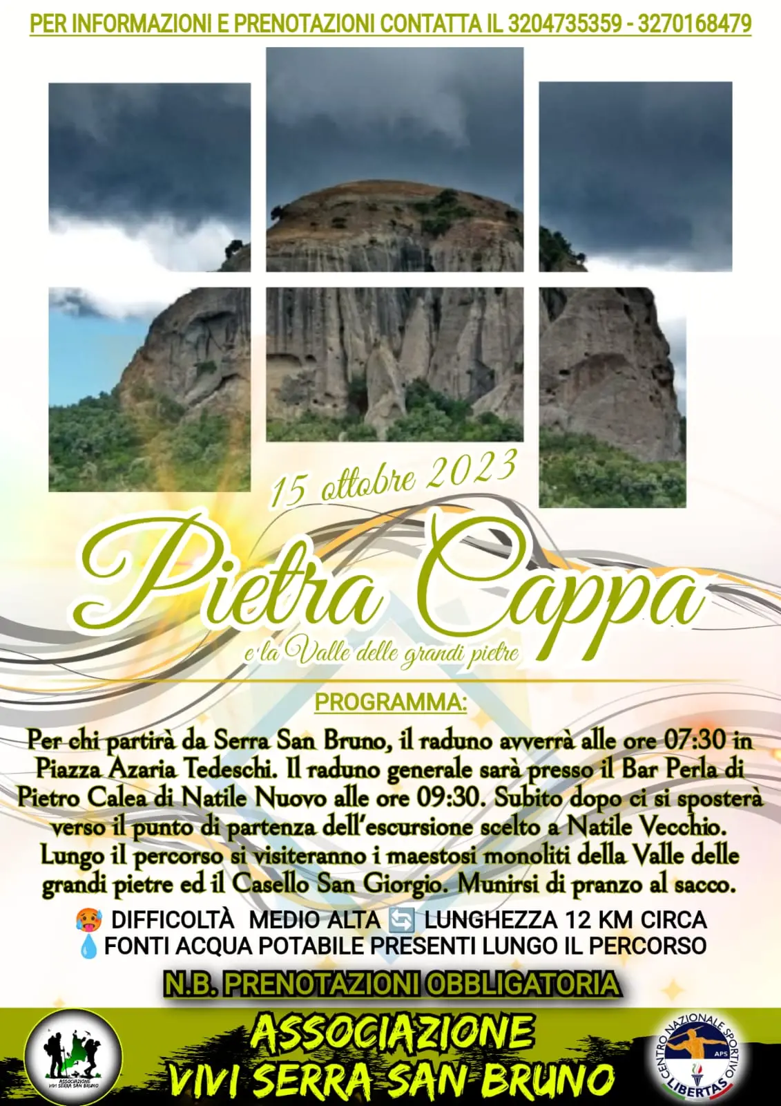 La tappa nel Reggino rappresenta un ulteriore tassello di un percorso in crescita che vede l’associazione collaborare e stringere solide amicizie con altri sodalizi attivi nel comprensorio calabrese: «Pietra Cappa, con la sua altezza di 140 metri e l’estensione di 4 ettari è un punto di grande richiamo a livello mondiale. Non per niente su di esso ci sono tanti misteri e leggende. Il suo nome “Cappa” deriva da “coppa rovesciata”, in riferimento alla cavità interna che la contraddistingue. Le origini di questo grande masso sono davvero antiche: nei documenti medioevali si legge di pietra Gauca ovvero pietra vuota, un toponimo riconducibile non solo a pietra Cappa ma a tutta la zona circostante». L’escursione avrà una durata di circa 5 ore con difficoltà medio-alta. «Sempre in giornata faremo una visita presso i ruderi della Chiesetta di San Giorgio, un monastero di epoca bizantina del VII-VIII sec d.C., una delle 4 chiese a croce greca in Calabria, meno famosa di Stilo ma probabilmente la più grande e maestosa delle quattro. In più i partecipanti avranno modo di osservare le rocce di San Pietro dove c’è anche il rifugio dove i monaci basiliani pregavano». Il raduno da Serra è previsto alle ore 7.30 del 15 ottobre.