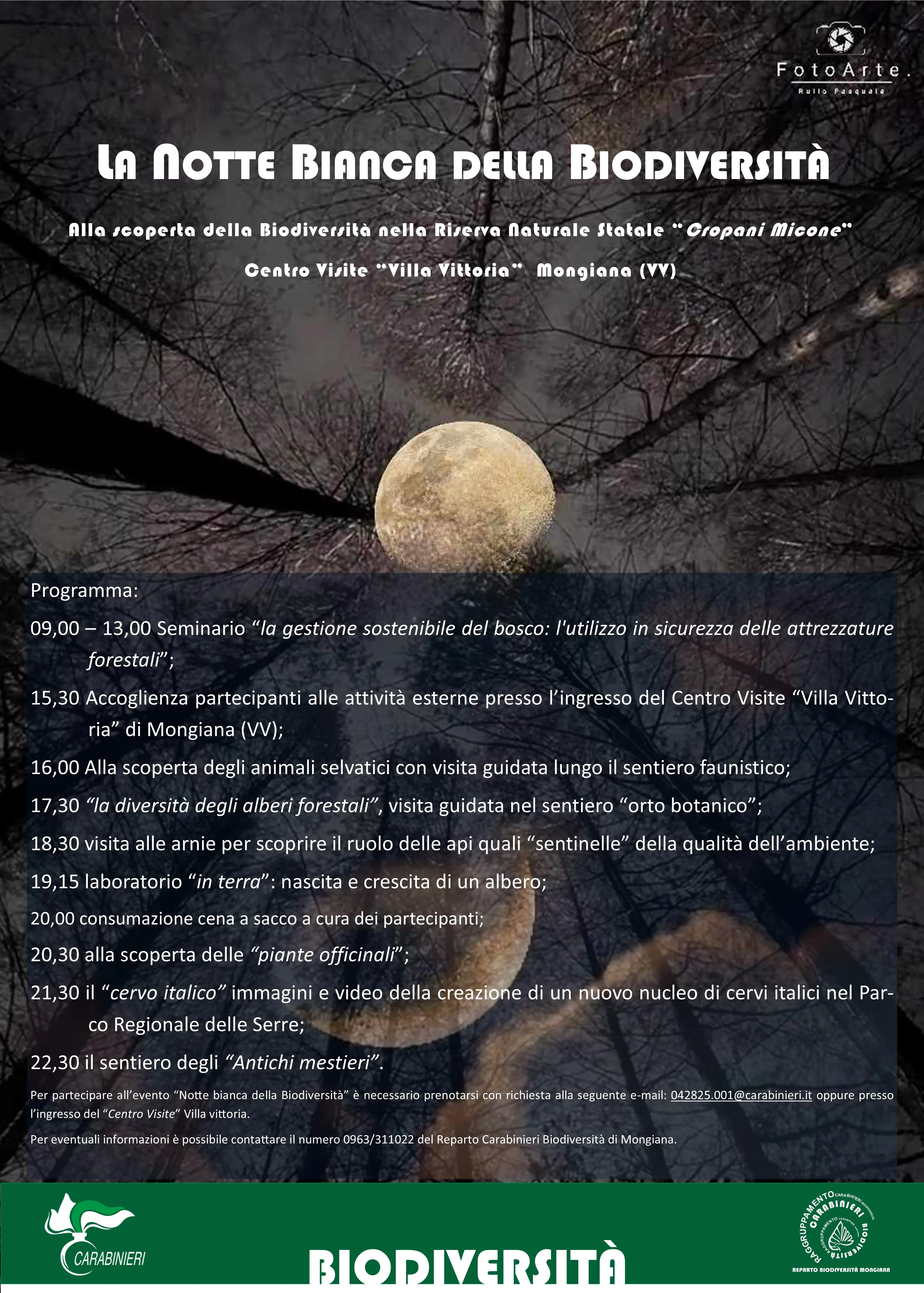 Il Reparto carabinieri biodiversità di Mongiana è pronto a regalare un’esperienza unica agli amanti della natura con la “Notte Bianca della Biodiversità”, in programma sabato 24 agosto. Quest’anno, l’evento prevede un’apertura straordinaria di Villa Vittoria dalle ore 08:30 fino a tarda serata, offrendo l’opportunità di scoprire la ricchezza della biodiversità e il delicato equilibrio che intercorre tra uomo e natura. L’evento si svolgerà presso il Centro visite di Villa Vittoria, gestito dal Reparto carabinieri biodiversità, dove i visitatori potranno usufruire di visite guidate, laboratori esperienziali gratuiti e seminari informativi. La partecipazione è aperta a tutti e si può scegliere di partecipare anche solo a una parte della giornata.