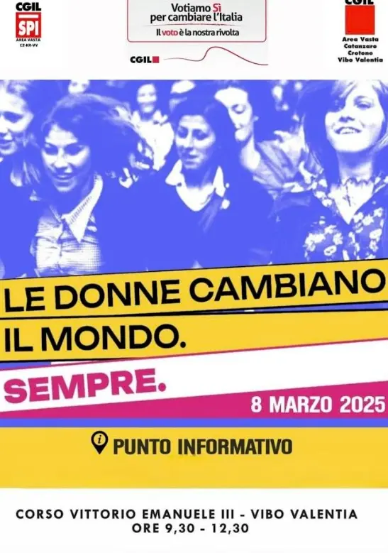 In occasione della Festa della donna, sabato 8 marzo, la Cgil Area Vasta Catanzaro-Crotone-Vibo allestirà punti informativi nelle piazze di Crotone e Vibo Valentia per sensibilizzare l’opinione pubblica sui quesiti referendari promossi dalla sigla sindacale a difesa dei diritti delle lavoratrici. Gli stand saranno allestiti a Crotone, in Piazza della Resistenza, dalle 10 alle 13, e a Vibo Valentia, in Corso Emanuele III. I dettagli contenuti in una nota stampa.