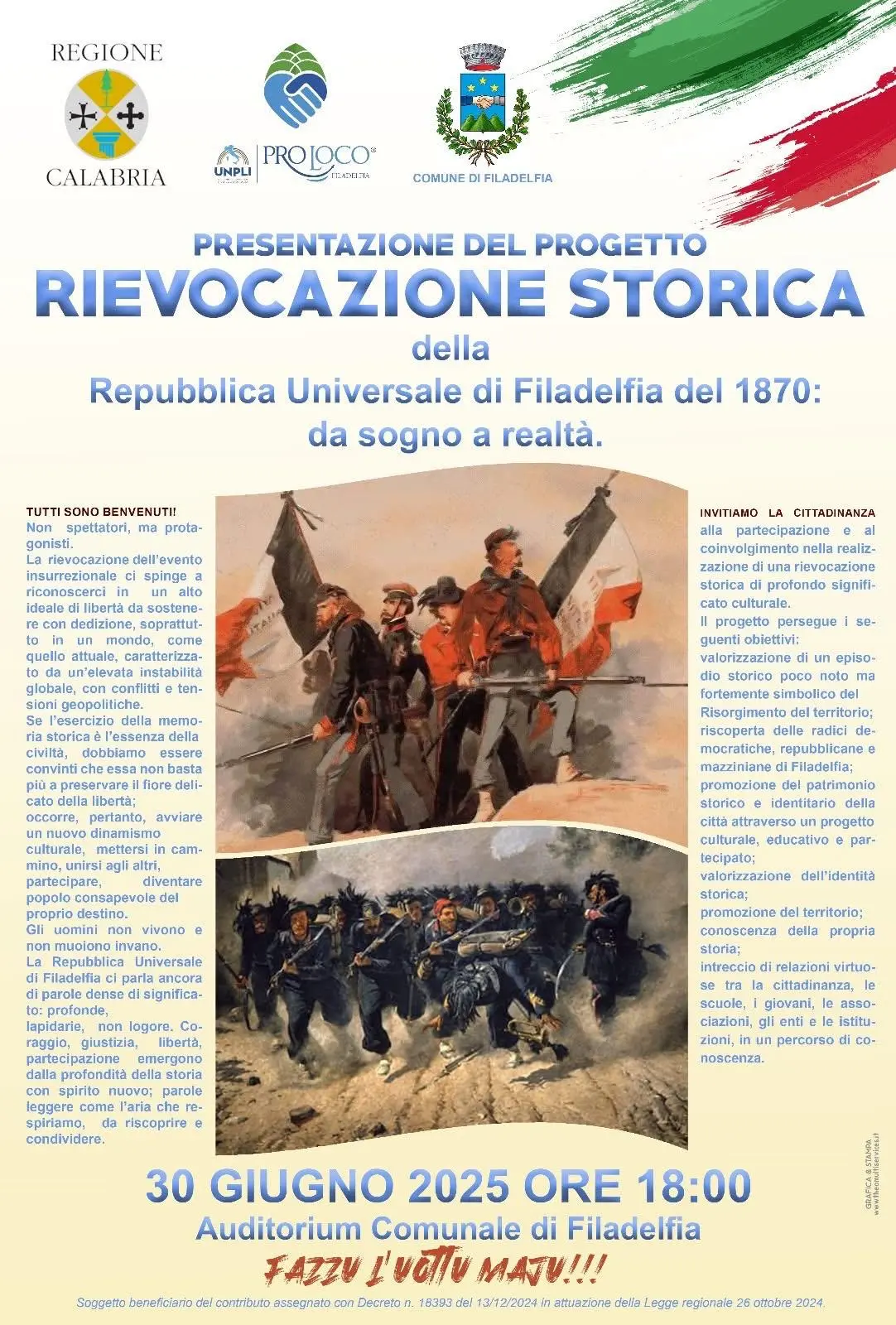 La comunità di Filadelfia è pronta a immergersi nel passato con un evento di grande portata: la “Rievocazione storica della Repubblica universale di Filadelfia del 1870: dal sogno alla realtà”. L’iniziativa, promossa con il patrocinio della Regione Calabria, dell’Unione nazionale Pro Loco d’Italia (Unpli) e del Comune di Filadelfia, si preannuncia come un momento di celebrazione della storia locale e di riflessione sui valori che l’hanno plasmata. L’evento si svolgerà il 30 giugno alle ore 18 nell’Auditorium comunale con la presentazione ufficiale del progetto. Un’occasione per la cittadinanza di scoprire i dettagli di una rievocazione che intende essere molto più di una semplice rappresentazione. L’associazione culturale Pro Loco di Filadelfia, ente beneficiario del contributo assegnato con Decreto n. 18393 del 13/12/2024 in attuazione della legge regionale 26 ottobre 2024, è al centro di questa iniziativa.