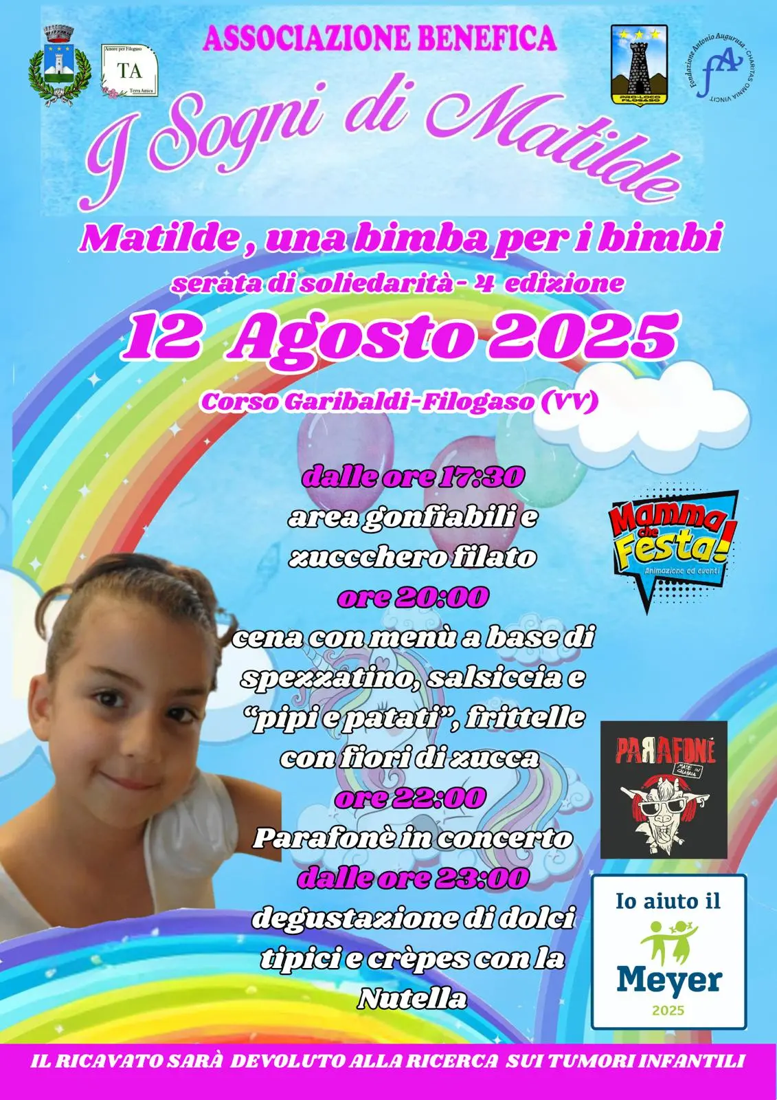 Con l’arrivo del mese di agosto ritorna nel Vibonese l’iniziativa solidale “Matilde, una bimba per i bimbi”, promossa a Filogaso dall’associazione onlus “I sogni di Matilde”, con il patrocinio del Comune e in collaborazione con Terra amica, Pro Loco e Fondazione Antonio Augurusa. L’appuntamento è per domani 12 agosto su Corso Garibaldi. La realtà di terzo settore organizzatrice dell’evento è sorta anni fa per volontà dei genitori della piccola Matilde Cugliari, morta nel dicembre del 2019 a causa di una malattia incurabile.