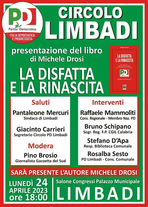 Lunedì 24 aprile, alle ore 18.00, nel salone congressi del Palazzo municipale di Limbadi si svolgerà la presentazione del libro di Michele Drosi dal titolo “La disfatta e la rinascita”. L’iniziativa è promossa dal circolo di Limbadi del Partito democratico. Interverranno in apertura il sindaco di Limbadi, Pantaleone Mercuri, e il segretario del circolo Pd, Giacinto Carrieri. L’iniziativa sarà moderata dal giornalista Pino Brosio. Presente l’autore Michele Drosi, con il quale converseranno il consigliere regionale e componente della direzione nazionale del Partito democratico Raffaele Mammoliti; il segretario regionale della Funzione pubblica della Cgil Bruno Schipano, il responsabile della biblioteca comunale Stefano D’Apa, il consigliere comunale di Limbadi ed esponente del Pd Rosalba Sesto.