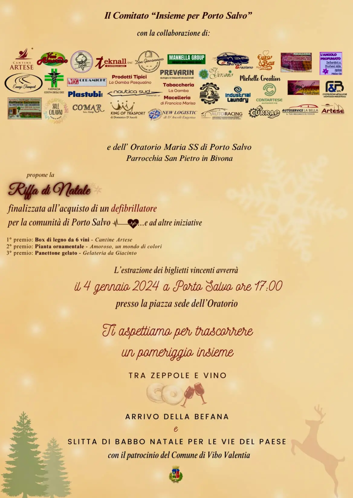 A Porto Salvo la befana è arrivata in anticipo. Proprio oggi, infatti, sono stati consegnati gratuitamente ai bambini caramelle e cioccolatini, mentre i più grandi hanno potuto degustare del buon vino delle Cantine Artese servito con le tradizionali zeppole. Con l’acquisto di vino e zeppole si avrà la possibilità di vincere un quadro di Maria SS di Porto Salvo offerto da Francesco Maduli. Il tutto culminerà con l’estrazione della riffa per contribuire all’acquisto di un defibrillatore, oltre ad avere la possibilità di vincere uno dei tre premi posti in palio; primo premio: box di legno con sei bottiglie di vino (Cantine Artese); secondo premio: pianta ornamentale (Amoroso, un mondo di colori); terzo premio: panettone gelato (Gelateria Giacinto). L’evento è stato organizzato dal comitato “Insieme per Porto Salvo” con la collaborazione dell’Oratorio Maria SS di Porto Salvo, della Parrocchia San Pietro di Bivona e di diversi sponsor. Tutto il ricavato sarà rendicontato e utilizzato per l’acquisto di un defibrillatore e della apposita teca termica.