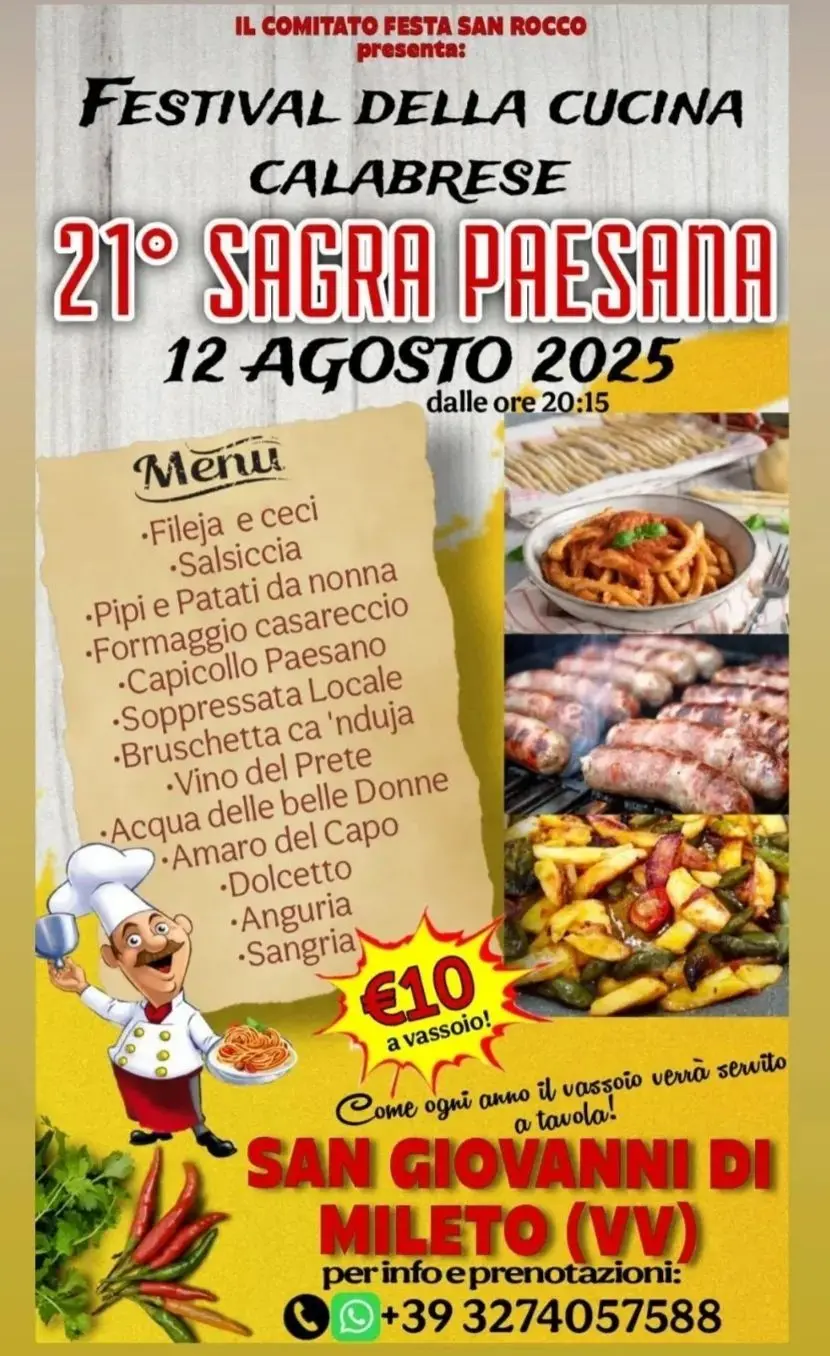 Il ricco menù, a partire dalle 20.15, prevede una cena a base di fileja e ceci, salsiccia con pipi e patati della nonna, formaggio casareccio, capicollo paesano, soppressata locale, bruschetta con la tipica ‘nduja, vino del prete, acqua delle belle donne, amaro del capo, dolcetto, anguria e sangria. A prepararla sarà uno staff composto anche da alcuni valenti chef che operano nei più noti villaggi della costa vibonese, pronti a mettere volontariamente a disposizione della comunità la propria arte culinaria. Sotto l’occhio attento del decano Nunzio Lacquaniti, a preparare i cibi saranno i cuochi Franco Gagliardi, Tonino e Francesco Staropoli, Saverio Labate, Michele Monteleone, Francesco Famà, Giuseppe Sabatino, Rocco Mangone, Manuel e Gianluca Pititto, Salvatore e Fortunato Labate, Tony Corigliano, Samuele Currà e, dulcis in fundo, la più che giovane promessa Nazzareno Gagliardi. Il costo del singolo vassoio proposto dalla Sagra Paesana di San Giovanni sarà di 10 euro. Le prenotazioni al numero telefonico 3274057588.