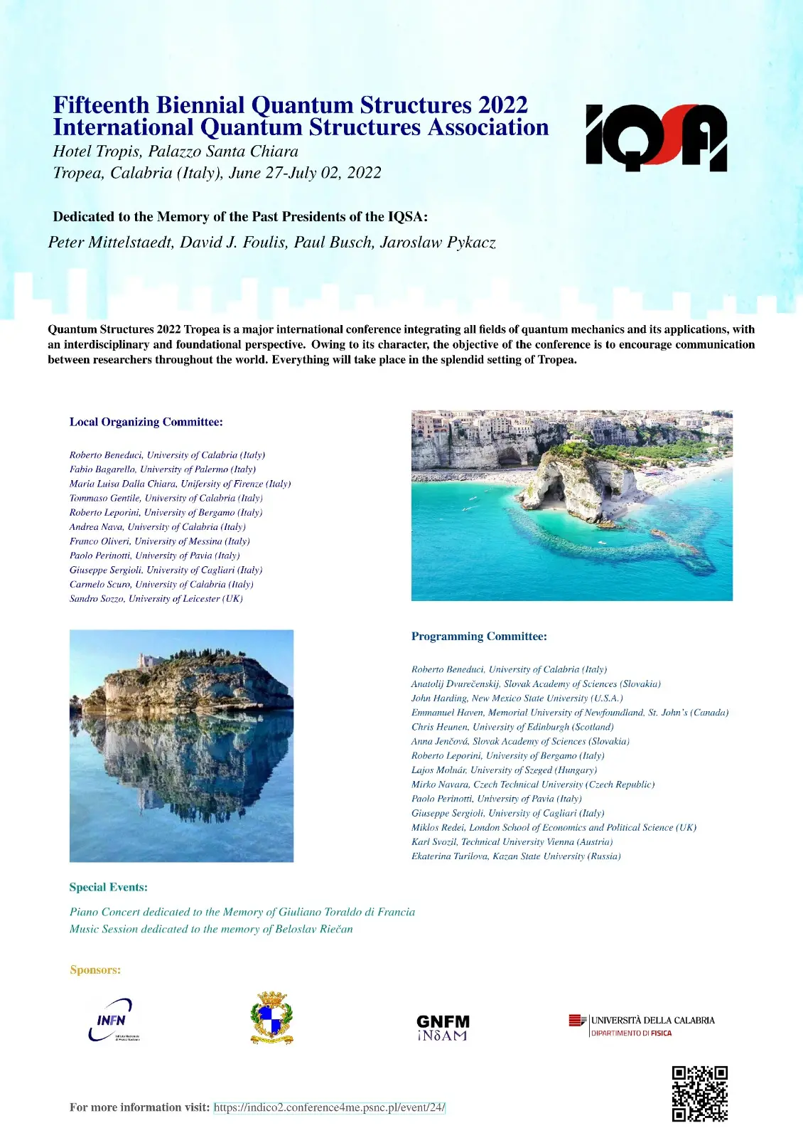 Dopo Danzica, Praga, Berlino, Vienna, Denver, Malta, Boston, Cagliari, Leicester, Bruxelles, la quindicesima edizione del convegno “International Quantum Structures 2022” – promosso ogni due anni dall’associazione internazionale IQSA (International Quantum Structures Association) sbarca a Tropea. Nella Perla del Tirreno arriveranno così fisici, matematici e filosofi provenienti da tutto il mondo che si confronteranno sui problemi più avanzati relativi ai fondamenti della fisica quantistica e delle applicazioni delle strutture quantistiche in psicologia, economia, teoria delle decisioni, ragionamento incerto. [Continua in basso]