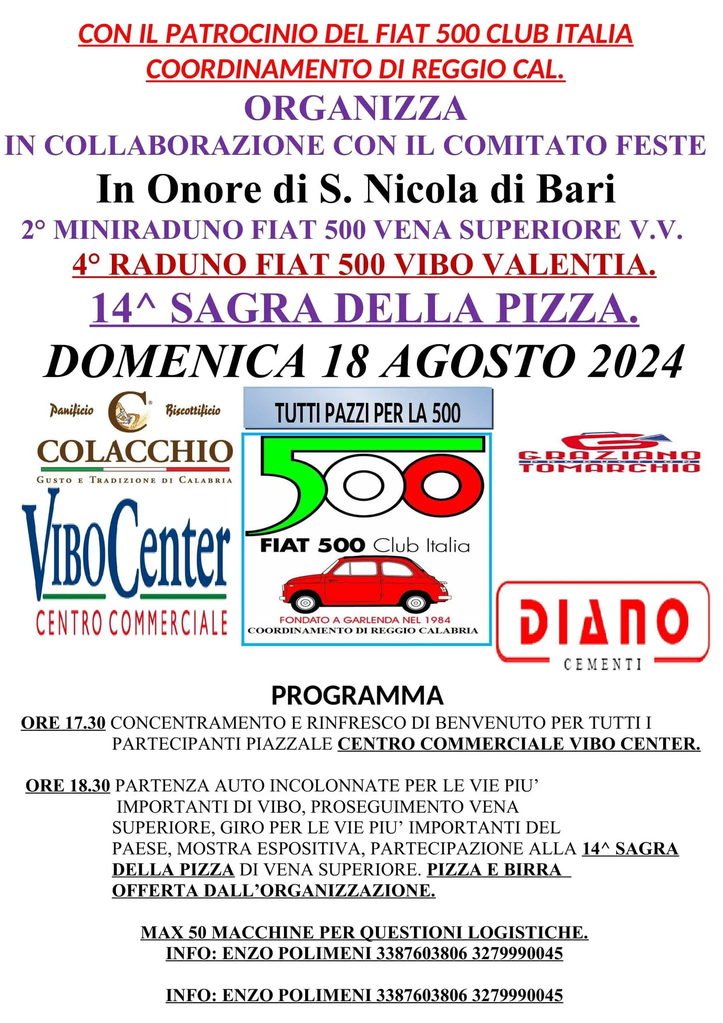 Vibo Valentia si prepara ad accogliere il IV Raduno delle mitiche Fiat 500. L’evento, proposto con il patrocinio del coordinamento di Reggio Calabria Fiat 500 Club Italia e in collaborazione con il comitato festa in onore di San Nicola di Bari, ingloberà al suo interno anche il secondo Miniraduno in programma nella frazione Vena Superiore in occasione della XIV edizione delle Sagra della Pizza. L’appuntamento è per domani 18 agosto alle 17.30 presso il piazzale del Centro commerciale Vibo Center, dove sono previsti il concentramento delle Fiat 500 e delle altre auto e moto d’epoca e il successivo rinfresco di benvenuto riservato dagli organizzatori a tutti i partecipanti.