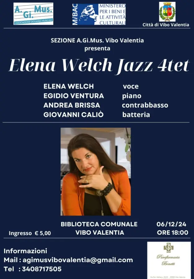In programma il 6 dicembre il concerto Jazz 4tet. Sul palco, la vocalist Elena Welch, al pianoforte Egidio Ventura, al contrabbasso Andrea Brissa, alla batteria Giovanni Caliò. L’evento si preannuncia coinvolgente ed evocativo.