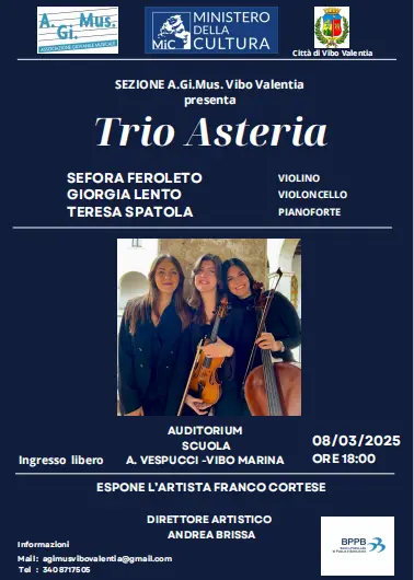 Sabato 8 marzo all’Auditorium della scuola Amerigo Vespucci di Vibo Marina, la sezione Agimus Vibo Valentia propone un viaggio sonoro con un concerto gratuito tenuto da talentuose giovani artiste, il Trio Asteria. «Per celebrare l’evento – commenta il direttore artistico Andrea Brissa – abbiamo scelto la scuola poiché simbolo di aggregazione sociale che pone quale fondamento della pianificazione educativa lo studente garantendo non solo il successo scolastico, con un ruolo attivo e propositivo, ma alla sua piena realizzazione sociale. Per la giornata internazionale della donna vogliamo offrire un appuntamento che sia, attraverso la musica, uno stimolo per rafforzare l’attenzione verso le donne. L’ensemble è formato dalle artiste calabresi Sefora Feroleto (violinista), Giorgia Lento (violoncellista) e Teresa Spatola (pianista) che si esibiranno in un concerto con un repertorio al femminile volto a promuove un dialogo anche con l’arte figurativa dell’artista vibonese Franco Cortese».