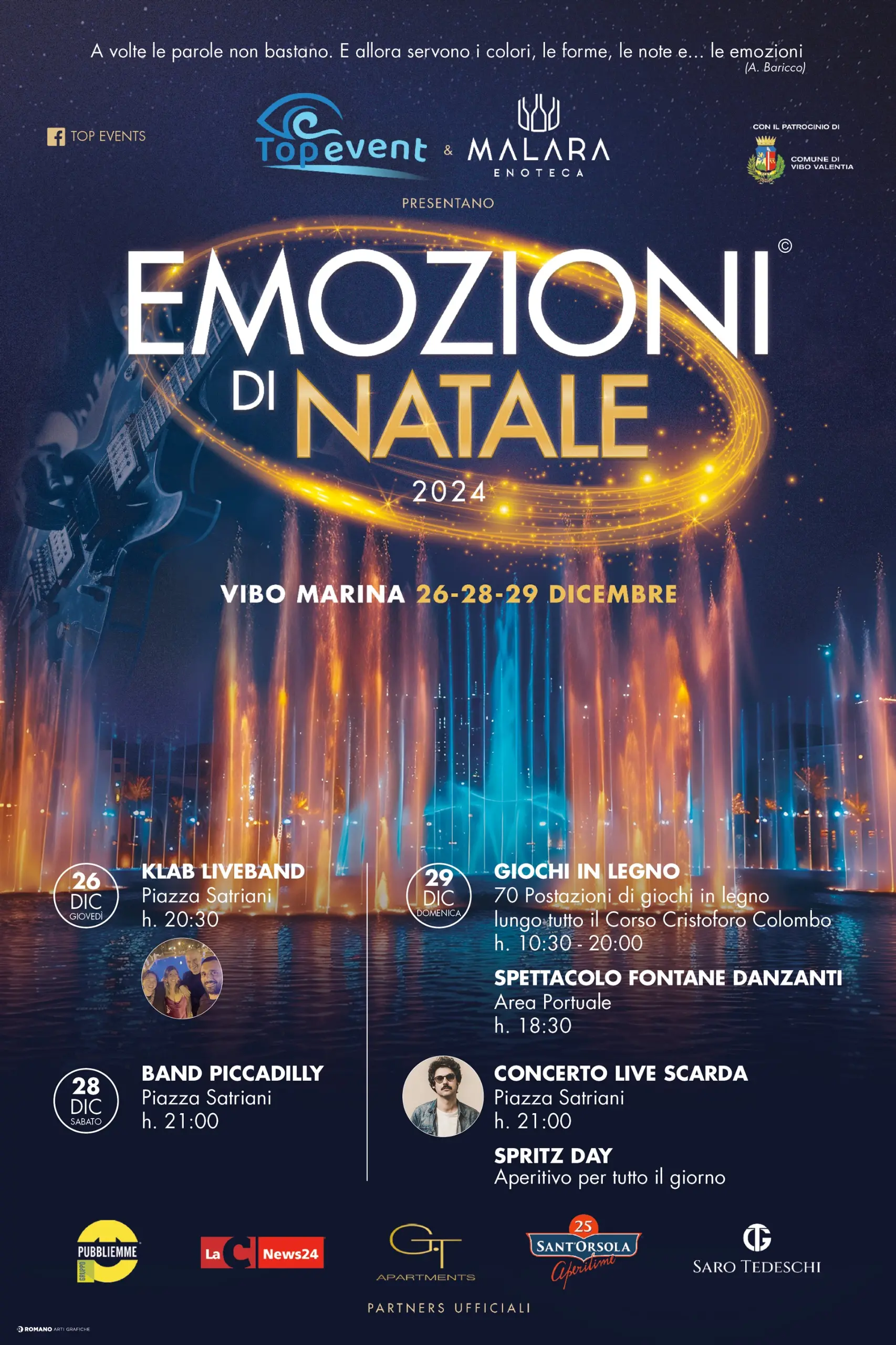 Vibo Marina si prepara a vivere le festività natalizie all’insegna dello spettacolo e della cultura, grazie a una tre giorni ricca di eventi. La Top Event presenta, infatti, la prima edizione di “Emozioni di Natale”: evento che si svolgerà nei giorni 26, 28 e 29 dicembre, unendo arte e musica all’insegna della promozione del territorio. Il tutto su un palcoscenico unico nel suo genere, nel cuore di Vibo Marina, tra il suggestivo lungomare Cristoforo Colombo, il porto e piazza Satriani.