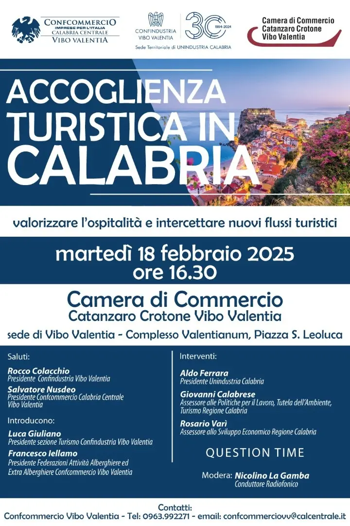 Confcommercio Calabria Centrale – Vibo Valentia, in collaborazione con Confindustria Vibo Valentia e la Camera di Commercio di Catanzaro, Crotone e Vibo Valentia, promuove il convegno “Accoglienza Turistica in Calabria – valorizzare l’ospitalità e intercettare nuovi flussi turistici”, che si terrà martedì 18 febbraio 2025 alle ore 16:30 presso la Camera di Commercio – sede di Vibo Valentia (Complesso Valentianum, Piazza S. Leoluca).