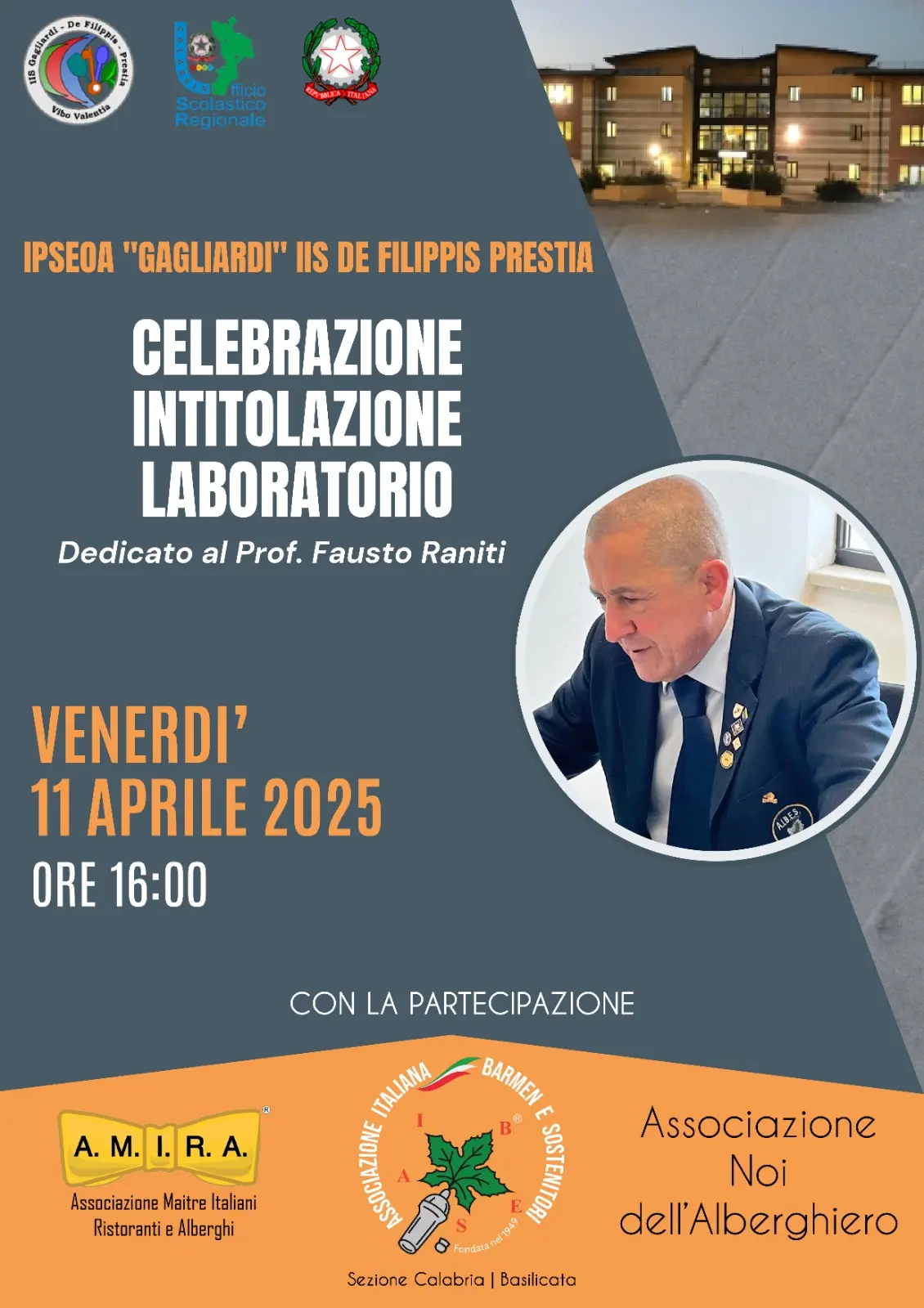 Nel corso della manifestazione sarà intitolato il laboratorio di sala e bar della scuola al compianto professore Fausto Raniti storico socio Aibes Calabria-Basilicata prematuramente scomparso nello scorso mese di giugno. L’Aibes sarà anche protagonista con il servizio di un cocktail dedicato al professore “Faustino Grapes”. Fausto Raniti molto amato da generazioni di studenti, era un’istituzione per l’istituto Alberghiero, attraverso la sua competenza, la sua umanità, il suo coraggio e il suo altruismo ha lasciato un segno indelebile nei suoi colleghi e nei suoi amati studenti.