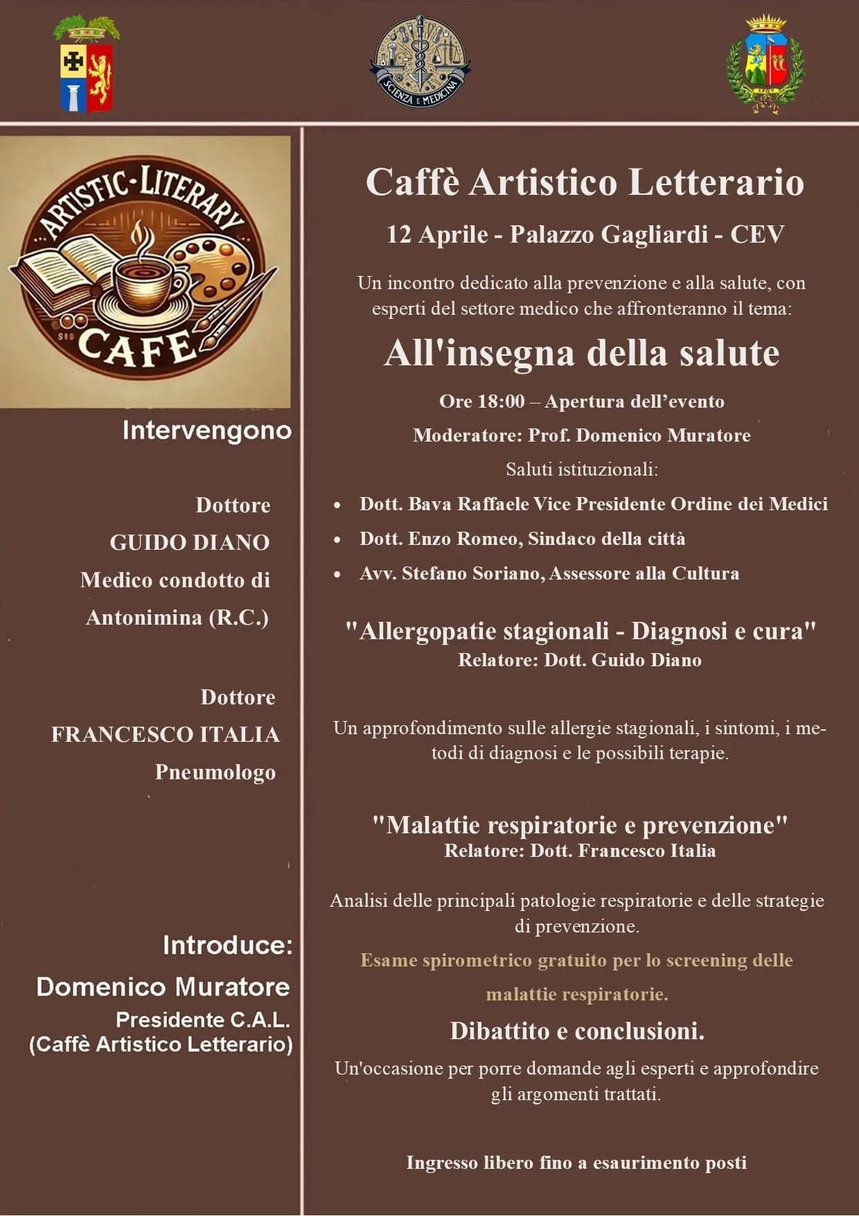 Si svolgerà sabato, nella sede del Cev a Palazzo Gagliardi alle ore 18:00, l’incontro dedicato alla prevenzione ed alla salute promosso dal Caffè artistico letterario, in cui saranno ospiti importanti esperti del settore medico. L’evento sarà moderato dal presidente, Domenico Muratore ed introdotto dai saluti di Raffaele Bava, vice presidente dell’Ordine dei medici di Vibo Valentia, del sindaco di Vibo Enzo Romeo e dell’assessore alla cultura Stefano Soriano.