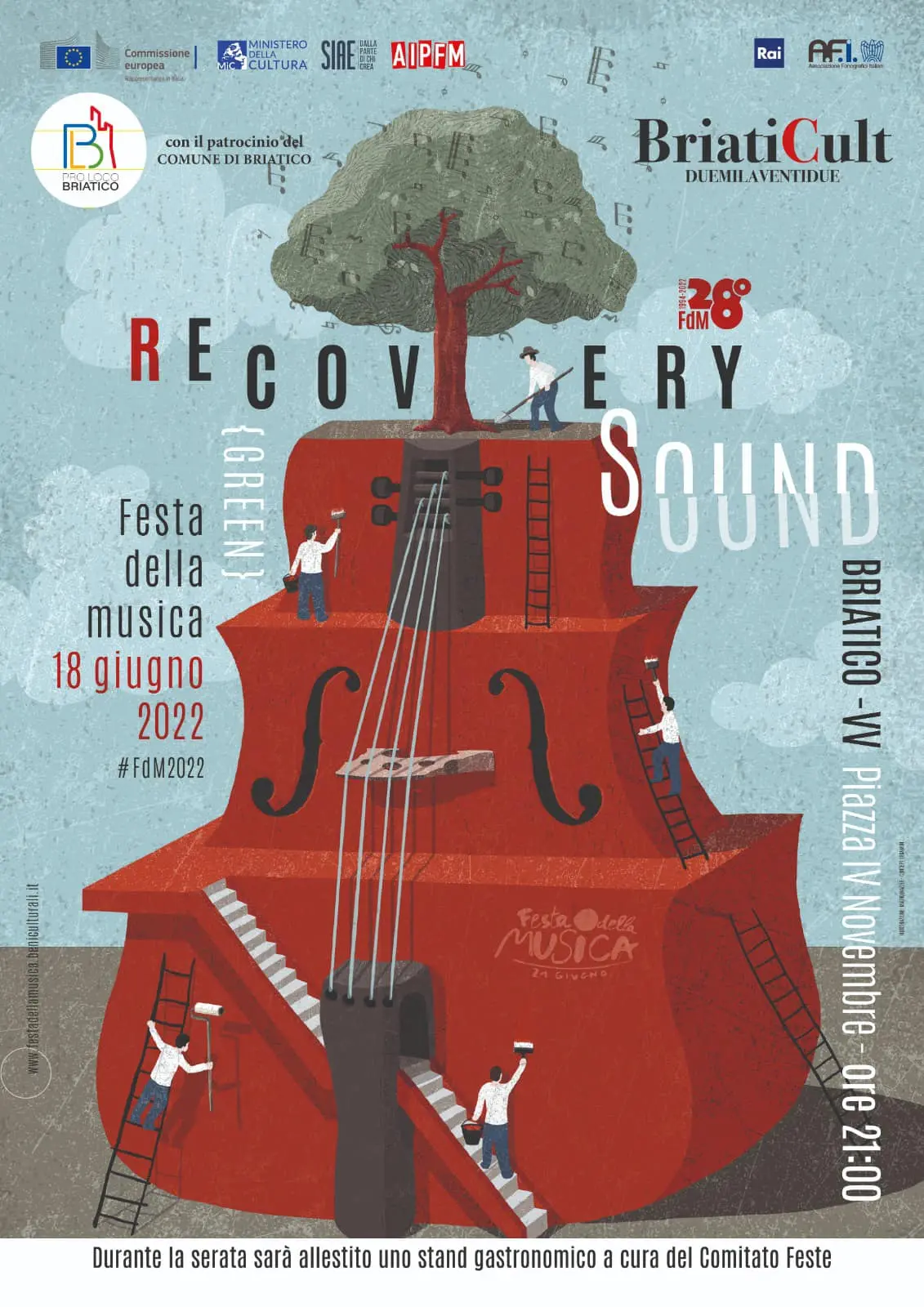 La Pro Loco di Briatico, con il patrocinio del Comune, aderisce alla “Festa della Musica”, l’unico evento musicale nazionale che coinvolge, durante la stessa giornata, più di 800 città e 45.000 artisti. Il festival, organizzato in collaborazione con la Commissione Europea, il Ministero della Cultura, la S.i.a.e. (Società italiana degli autori e degli editori), l’A.i.p.f.m. (Associazione italiana per la promozione della Festa della Musica), la Rai e l’Afi (Associazione fonografici italiani), si terrà a Briatico sabato 18 giugno, alle ore 21:00, in piazza IV novembre. L’evento sarà all’interno della rassegna “BriatiCult”, e si chiamerà “Recovery Sound”. Si esibiranno il maestro Francesco Gugliotta, il musicista Umberto Franco, la chitarrista Elisabeth Morabito, il trio di musicisti composto da Alessandro Zagari, Vincenzo Budriesi e Vincenzo Scordamaglia, la cantante Federica Lacquaniti e il duo costituito da Domenico Arena e Cecilia Larosa.
