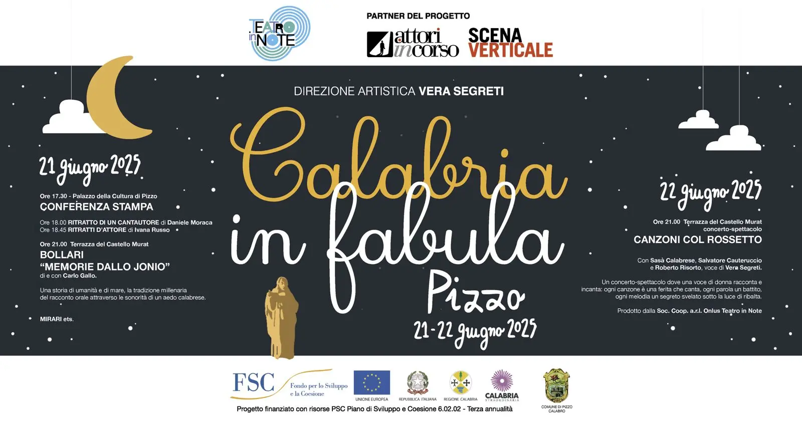 La tappa di Pizzo prenderà il via sabato 21 giugno alle ore 17:30 al Palazzo della Cultura, con la conferenza stampa che vedrà la partecipazione della direttrice artistica Vera Segreti e del sindaco Sergio Pititto. A seguire, alle 18:15, Daniele Moraca presenterà ”Ritratto di un cantautore”: una performance voce e chitarra che attraversa la storia della canzone d’autore italiana, alternando brani originali e omaggi ai grandi cantautori.