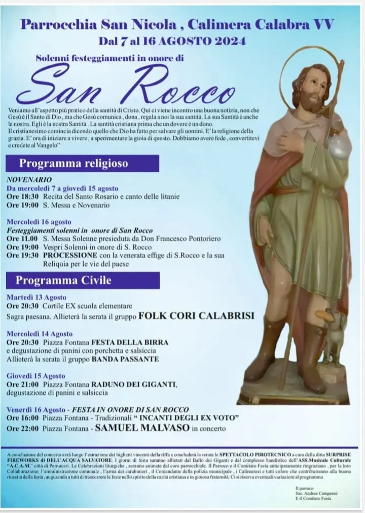 Calimera si prepara a celebrare i festeggiamenti in onore di San Rocco, compatrono con San Nicola della piccola frazione di San Calogero. «Il sacerdote don Andrea Campennì e il Comitato festa – hanno fato sapere gli organizzatori – hanno lavorato a lungo per allestire un programma religioso e civile di tutto rispetto. Alla fine saranno cinque i giorni di festa, dal 12 al 16 agosto». San Rocco è il Santo patrono di coloro che soffrono di malattie contagiose. Vissuto nel XIV secolo, è venerato per il suo impegno nell’assistere i malati di peste, a cui prestava cura durante i suoi pellegrinaggi.
