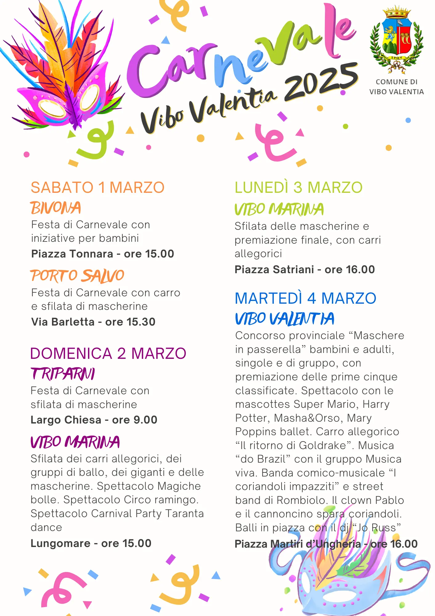 Domenica 2 marzo è Vibo Marina la protagonista del carnevale. Tra via Monteleone, corso Bianchi, corso Colombo, il lungomare, a partire dalle ore 15 si snoderanno le principali attività organizzate dalla parrocchia Maria Santissima del Rosario di Pompei. Ci sarà la sfilata dei carri allegorici, dei gruppi di ballo, dei giganti e delle mascherine. Ma non solo: tantissimi gli spettacoli, con le magiche bolle, il circo ramingo, il Carnival party taranta dance. Divertimento per tutti i gusti e tutte le fasce d’età. Anche Triparni si colorerà di maschere e coriandoli domenica 2 marzo, con l’evento organizzato dalla parrocchia San Nicola in piazza Largo chiesa dalle ore 9 alle ore 14.