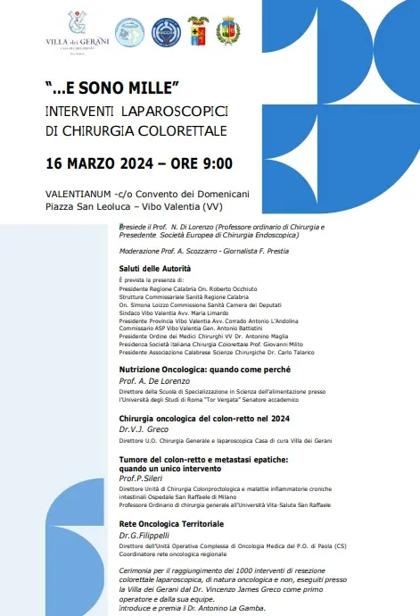 “E sono mille”, interventi laparoscopici di chirurgia colorettale. Sarà questo il tema del convegno in programma il 16 marzo, dalle ore 9.00, al Valentianum, Convento dei domenicani, Vibo Valentia. L’iniziativa, che vedrà la presenza di eminenti studiosi ed esperti del settore, prende lo spunto dall’esaltante traguardo raggiunto dal primario Vincenzo James Greco che, con la sua équipe, ha superato recentemente la quota di 1000 interventi di chirurgia laparoscopica colorettale. L’appuntamento, presieduto dal professor N. Di Lorenzo, professore ordinario di Chirurgia e presidente Società Europea di chirurgia endoscopica, sarà moderato dal professor Agostino Scozzarro e dal giornalista Francesco Prestia. È prevista la presenza del governatore Roberto Occhiuto; di Simona Loizzo, della Commissione Sanità alla Camera dei deputati; del sindaco di Vibo, Maria Limardo; del presidente della Provincia, Corrado L’Andolina, del commissario straordinario Asp, Antonio Battistini; del presidente dell’Ordine medici e chirurghi, Antonio Maglia. E ancora, Giovanni Milito, Presidenza Società italiana Chirurgia colorettale; Carlo Talarico, presidente Associazione calabrese scienze chirurgiche.