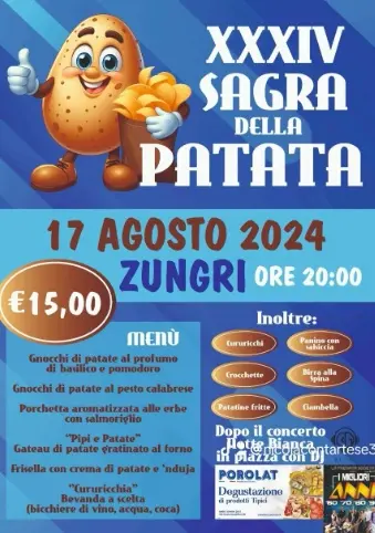 È uno dei prodotti simbolo del comprensorio del Poro. Qui, infatti, il terreno sabbioso favorisce la sua coltivazione. A Zungri tutto pronto per la Sagra della patata in programma il 17 agosto in piazza della Madonna della neve, a partire dalle ore 20.00. L’appuntamento è promosso da un gruppo spontaneo di ragazzi che ormai anni organizzano l’evento enogastronomico. La sagra richiama centinaia di presenze turistiche e locali. Tutto viene organizzato nei minimi dettagli con l’obiettivo di garantire accoglienza e pietanze di qualità: «Lo stand gastronomico è, ovviamente, a base di patate, tipico tubero del territorio zungrese, coltivato in terreni sabbiosi che nelle nostre campagne abbondano. Identifica Zungri così come l’olio e la “suriaca” a burro o cannellina», anticipano i promotori. A fare da cornice degustazioni di prodotti tipici e musica.