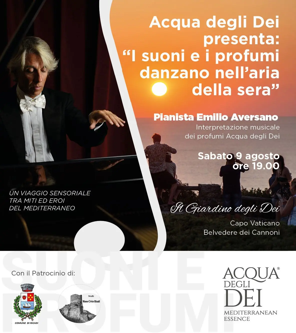 Sulla cima di Capo Vaticano, nel suggestivo “Giardino degli Dei”, sabato 9 agosto alle ore 19 si terrà un evento culturale di grande fascino e impatto sensoriale: il concerto per pianoforte del maestro Emilio Aversano, intitolato “I suoni e i profumi danzano nell’aria della sera”. L’iniziativa, organizzata dall’azienda “Acqua degli Dei” con il patrocinio del Comune di Ricadi, promette un’esperienza unica, in cui le note del pianoforte si intrecceranno con le essenze e i profumi della linea di fragranze, creando un connubio tra musica e olfatto in un contesto mozzafiato.