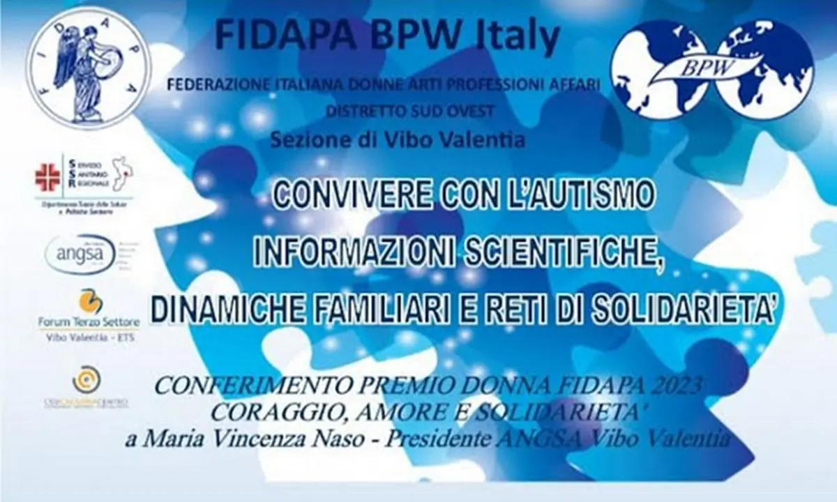Organizzato dalla Fidapa Sezione di Vibo Valentia si svolgerà il 28 marzo una giornata di sensibilizzazione dal titolo “Convivere con l’Autismo, informazione scientifica, dinamiche familiari e reti di solidarietà”. Nel corso della serata sarà conferito un premio alla presidente dell’Associazione ANGSA (Associazione Nazionale Genitori Persone con Autismo), Maria Vincenza Naso.
