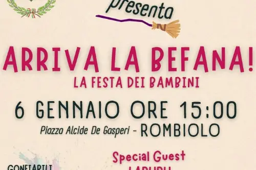 Sui social l’invito alla partecipazione da parte dell’amministrazione: «Martedì 6 gennaio, alle ore 15:00, vi aspettiamo in piazza Alcide De Gasperi per una Festa della Befana tutta da vivere… tra musica, allegria e sorprese per tutta la famiglia. Un pomeriggio speciale per grandi e piccini, animato dall’energia travolgente della Cala Street Band, la band itinerante che porterà ritmi festosi per le vie di Rombiolo accompagnandoci fino in piazza»,