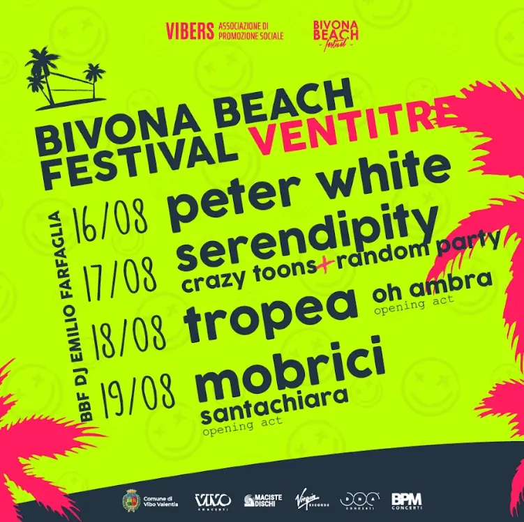 La serata conclusiva inizierà con Santachiara, il 19 agosto, e continuerà con Mobrici, già leader dei celebri Canova, con il suo nuovo album “Gli anni di Cristo”. Mobrici vanta collaborazioni eccellenti (Brunori Sas, Fulminacci, Gazzelle, Vasco Brondi, Lo Stato Sociale) oltre a tantissimi successi discografici che ne fanno uno degli artisti più importanti della scena indipendente italiana. Ogni serata sarà seguita dal dj set in compagnia di Emilio Farfaglia che farà alzare le mani al cielo per danzare insieme il meglio della musica italiana e internazionale. “Sono felice quanto sorpreso della strada che abbiamo fatto e dei risultati che il Festival ha ottenuto, soprattutto per il contesto nel quale operiamo. Vibo Valentia è un terreno difficile, a tratti inospitale, per questo tipo di eventi. Sia la cittadinanza, ma soprattutto i soggetti con cui ci interfacciamo per portare artisti e organizzare il tutto, hanno percepito una credibilità crescente e quindi spesso sono loro che si avvicinano a noi, perché il Bivona Beach Festival è diventato un’occasione nuova, lodevole e di valore. Questo ci riempie sicuramente di orgoglio e ci spinge a non mollare, anche davanti alle sfide che ogni anno ci si pongono davanti. Un grande supporto arriva poi anche dalle persone: anche i più scettici inizialmente, si sono poi avvicinati con entusiasmo al progetto e hanno sposato l’anima di questo grande evento estivo” così Antonio Tocco, presidente dell’associazione Vibers, esprime la sua emozione davanti ai traguardi raggiunti.