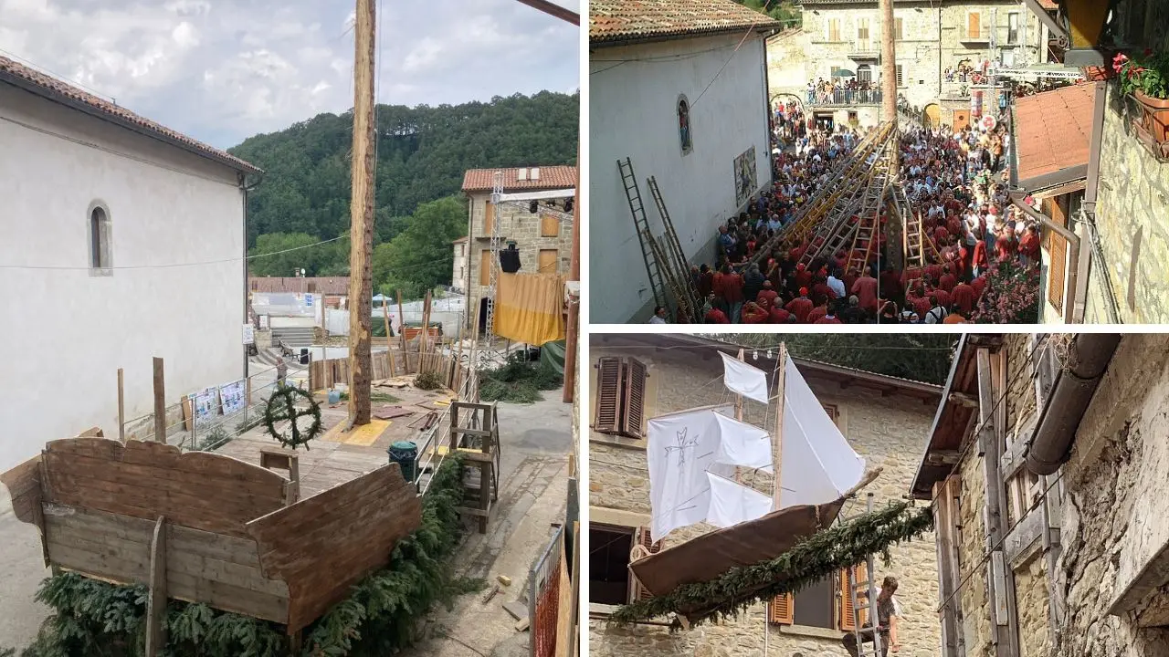 Di Spelonga di Arquata, borgo marchigiano alle falde del monte Vettore, di integro non c’è rimasto molto. Il paese, reso celebre dal film di Pietro Germi «Serafino» grazie ad un magistrale Adriano Celentano nei panni dell’omonimo pastore, è venuto giù il 24 agosto 2016 con un terremoto che ha lesionato case, chiesa, piccoli negozi, Municipio. 300 morti, 41mila sfollati, 131 paesi compromessi. Una delle più grandi tragedie italiane dell’ultimo trentennio. E se peggio ancora è andata agli altri paesi del Tronto – Pescara ed Amatrice, praticamente rase al suolo -, anche qui, dove pure la fisionomia del paese ancora si intravede, tra puntelli e cantieri, le cicatrici sono devastanti. Quello che il terremoto non ha scalfito ma anzi alimentato è il senso di appartenenza di una comunità che ogni tre anni si raduna per ricordare con orgoglio i 150 coscritti montanari chiamati da Venezia alla battaglia di Lepanto (in gran parte galeotti, ma tant’è…). È «La Festa Bella»: un mese di gare giochi, grigliate e gare di poesia estemporanea, tra navi sospese, e addobbi ispirati alla battaglia