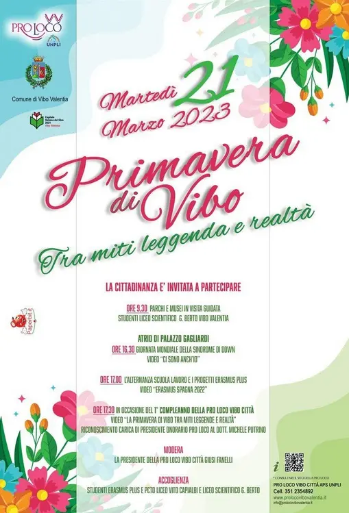 Martedì 21 marzo sarà celebrata la “Primavera di Vibo” tra miti, leggenda e realtà. L’evento si svolgerà tutta la giornata. Il programma prevede alle ore 9,30 una visita guidata ai parchi e ai musei della città con gli studenti del liceo scientifico Berto. Nel pomeriggi, alle ore 16:30 nell’atrio di Palazzo Gagliardi, nell’ambito della giornata mondiale della sindrome di Down sarà proiettato il video: “Ci sono anch’io”. Alle ore 17,00 la presentazione dei progetti di alternanza scuola-lavoro e i progetti Erasmus plus. Alle ore 17,30 in occasione del primo compleanno della Pro loco Vibo città, si svolgerà un dibattito moderato dalla presidente della Pro loco di Vibo Giusy Fanelli nel corso del quale sarà conferita la carica di presidente onorario della Pro loco a Michele Putrino.