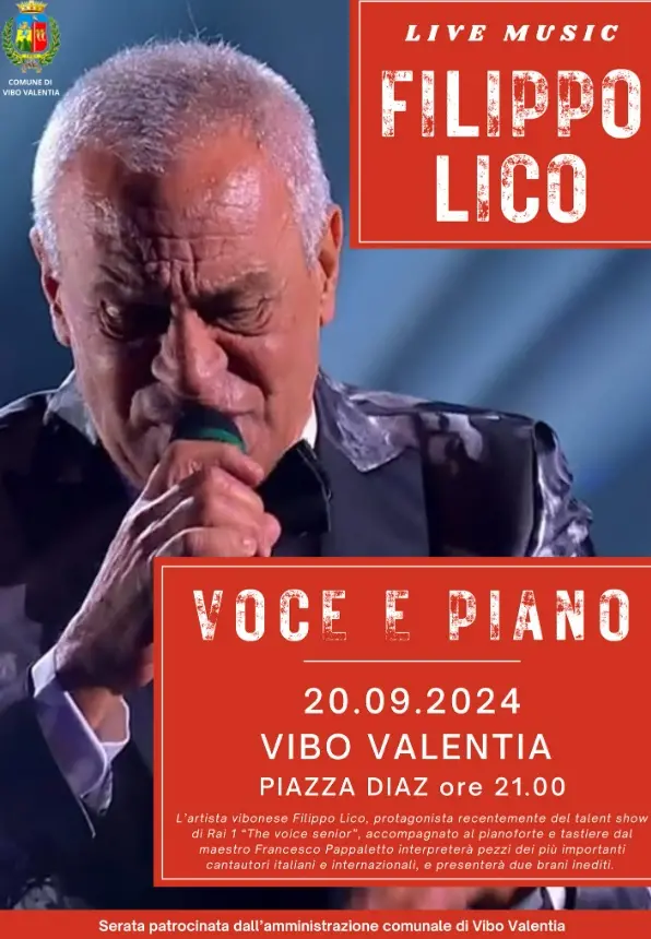Dopo il successo di “The voice senior”, competizione canora in onda su Rai 1, Filippo Lico è pronto ad abbracciare il pubblico della sua Vibo Valentia. Il concerto, patrocinato dall’amministrazione comunale, si terrà il 20 settembre in piazza Diaz, alle ore 21.00. L’ingresso è gratuito. Ad accompagnare l’artista, al pianoforte e tastiere il maestro Francesco Pappaletto, insieme ad altre apprezzate voci del panorama musicale locale. Lico spazierà su brani di grandi interpreti nazionali e internazionali, come Ray Charles e Mina, soffermandosi poi sul cantautorato italiano con brani di De Andrè, Tenco e molti altri.