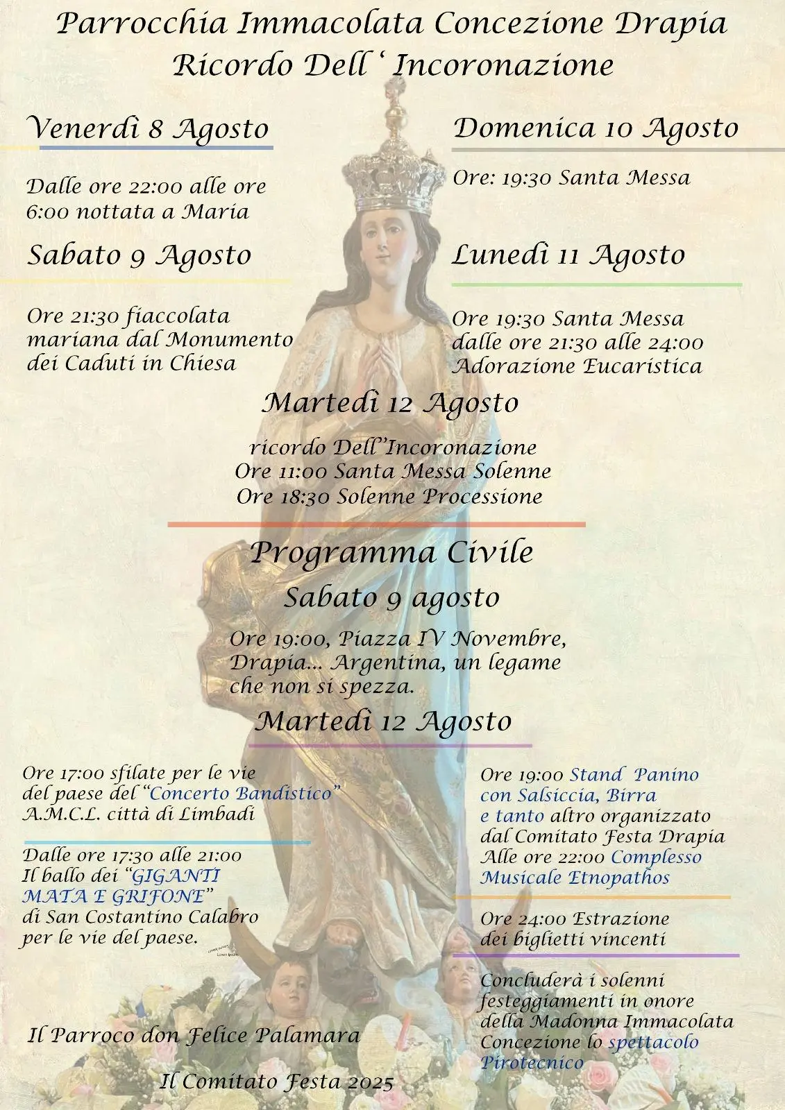 La comunità di Drapia si prepara a vivere cinque giorni intensi di spiritualità, cultura e festa in occasione del ricordo dell’incoronazione della Madonna dell’Immacolata Concezione, patrona del paese. Dal 8 al 12 agosto, la parrocchia, guidata da don Felice Palamara, insieme al Comitato festa, ha organizzato un ricco programma di eventi religiosi e civili che coinvolgeranno residenti e visitatori. La parte spirituale della festa inizierà venerdì 8 agosto con una nottata di preghiera a Maria dalle ore 22 alle 6. Sabato 9, la tradizionale Fiaccolata mariana partirà alle 21:30 dal Monumento dei Caduti fino alla chiesa. Il cuore della celebrazione sarà martedì 12 agosto, giorno del ricordo dell’incoronazione, con la santa messa solenne alle 11 e la processione alle ore 18:30, momento assai sentito dalla comunità.