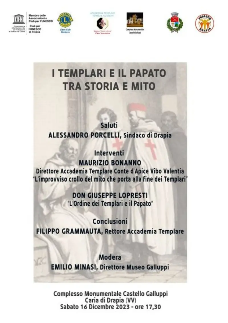 Continuano le attività culturali all’interno del complesso monumentale del museo “Pasquale Galluppi” di Caria, promosse dal direttore Emilio Minasi. Il prossimo appuntamento, che catapulta l’attenzione in uno spaccato di storia assai interessante, si terrà sabato 16 dicembre alle ore 17:30 e si concentrerà sul tema “I Templari e il papato, tra storia e mito”. Dopo i saluti del sindaco di Drapia Alessandro Porcelli, seguiranno gli interventi del giornalista Maurizio Bonanno, direttore dell’Accademia templare “Conte d’Apice” di Vibo Valentia, e di don Giuseppe Lopresti. Bonanno si focalizzerà sul tema “L’improvviso crollo del mito che porta alla fine dei Templari”, mentre don Lopresti tratterà il focus su “L’ordine dei Templari e il papato”. Le conclusioni dell’incontro moderato dallo stesso direttore del museo Emilio Minasi, sono poi affidate a Filippo Grammauta, rettore dell’Accademia templare vibonese. Il convegno è promosso dal Club per l’Unesco di Tropea, Lions Club di Nicotera, la stessa Accademia templare “Conte d’Apice” di Vibo Valentia, l’amministrazione comunale di Drapia e la Proloco di Drapia.