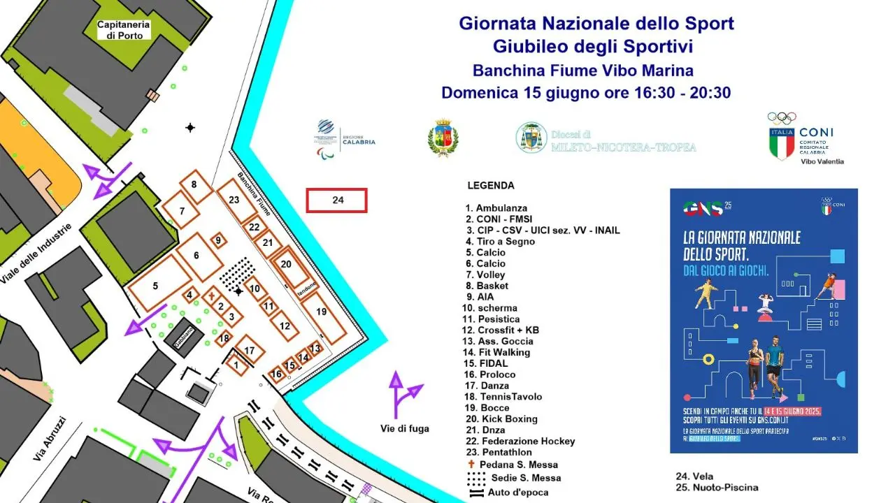 Durante il pomeriggio saranno attivi numerosi stand informativi curati da associazioni e realtà istituzionali tra cui l’AIA – Associazione italiana arbitri, la FIMMG – Federazione medici sportivi, il CIP – Comitato italiano paralimpico, il Centro servizi per il volontariato Catanzaro-Crotone-Vibo, la Pro Loco di Vibo Marina, l’associazione La Goccia, l’UICI – Unione italiana ciechi e ipovedenti e l’INAIL. Il servizio sanitario e il presidio dei varchi d’accesso saranno garantiti dalle associazioni di Protezione civile “Augustus” e “Anpanagepa” in collaborazione con la Polizia municipale di Vibo. Alle ore 19:15, sempre nel piazzale del Porto, si terrà la santa messa dello sportivo presieduta dal vescovo Attilio Nostro. La manifestazione si concluderà con l’esibizione del gruppo folkloristico “Città di Vibo Valentia”, spettacolo offerto dall’associazione Vibo Marina C’è.