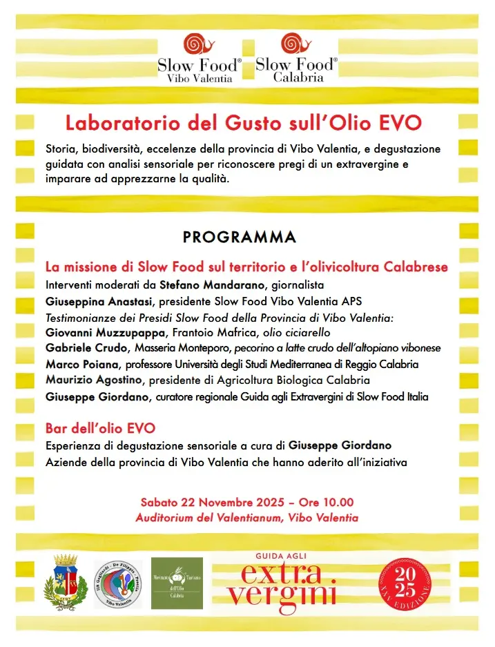 Un evento che chiamerà a raccolta produttori, esperti e addetti ai lavori per accendere i riflettori sulla missione di Slow Food nel territorio, con una particolare attenzione al settore olivicolo. Nell’occasione, una degustazione guidata consentirà di effettuare analisi sensoriali necessarie a riconoscere i pregi di un extravergine e apprezzarne caratteristiche e qualità. L’evento si inserisce, inoltre, nel solco della presentazione della Guida agli extravergini 2025 di Slow Food Italia che proprio a Vibo Valentia, nel giugno scorso, ha avuto la sua vetrina regionale.