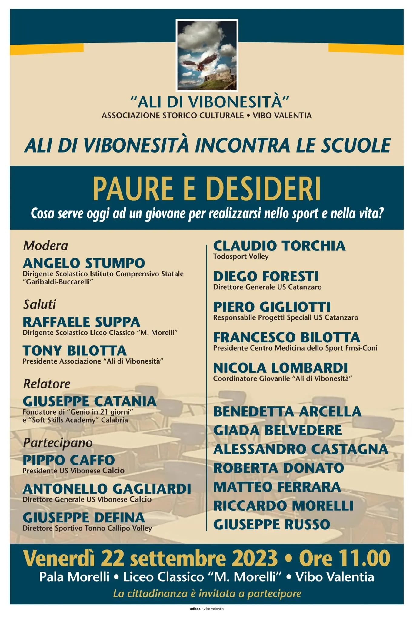 “Ali di Vibonesità”, l’associazione storico culturale “sorta per consegnare al più presto ai giovani il testimone della storia di ieri e di oggi con l’aggiunta di pensare ad una buona idea per il benessere comune continua ad avere come suo interlocutore privilegiato il mondo della scuola. Ed insiste sul filone, avviato lo scorso anno, organizzando per dopodomani, venerdì, con inizio alle ore 11, nell’aula magna del Liceo classico Michele Morelli, con la presenza di quasi tutte le delegazioni scolastiche, un interessante e attuale evento su un tema di scottante attualità: “Paure e desideri: cosa serve oggi ad un giovane per realizzarsi nello sport e nella vita?” che sarà moderato da Angelo Stumpo, dirigente scolastico dell’Istituto Comprensivo “Garibaldi-Buccarelli”. Con la scuola – spiega l’associazione – sarà presente lo sport rappresentato da Pippo Caffo e Antonello Gagliardi, rispettivamente presidente e direttore generale della US Vibonese; Giuseppe Defina direttore sportivo della Tonno Callipo Volley; Claudio Torchia della Todosport Volley; Diego Foresti e Piero Gigliotti, direttore generale del Catanzaro e Responsabile Progetti Speciali dell’US Catanzaro che saranno i delegati del presidente Floriano Noto; Francesco Bilotta presidente del Centro di Medicina dello Sport Fmsi-Coni. Infine Nicola Lombardi, coordinatore giovanile di “Ali di Vibonesità”, cui si deve l’iniziativa, che ha pensato di mettere in piedi anche un pool di giovani studenti per rendere effervescente il dibattito, invitando ad intervenire Benedetta Arcella, Giada Belvedere, Alessandro Castagna, Roberta Donato, Matteo Ferrara, Riccardo Morelli e Giuseppe Russo”. I saluti di rito toccheranno a Raffaele Suppa, dirigente scolastico del Liceo Michele Morelli e Tony Bilotta presidente di “Ali di Vibonesità”. Stati d’ansia, stress, tensioni, comportamenti, obiettivi e ambizioni nella vita di tutti i giorni dei giovani saranno al centro della relazione introduttiva del dott. Giuseppe Catania, fondatore di “Genio in 21 giorni” e “Soft Skills Academy” Calabria, un esperto dell’apprendimento chiamato a spiegare i segreti nascosti e sconosciuti sul come apprendere meglio ed in meno tempo. Come migliorare scientificamente il metodo di studio ? “Oggi il mondo del lavoro richiede sia le competenze tecniche (Hard) che quelle trasversali (Soft) – anticipa, tra l’altro, Giuseppe Catania – e le Soft Skills sono quelle da inserire nella sezione Formazione del CV di ognuno. I responsabili Risorse Umane delle società medio-grandi richiedono la padronanza di queste abilità ma nessun percorso universitario le insegna. Spesso questo campo viene quindi lasciato vuoto.” Come un giovane deve presentarsi ad un colloquio in modo efficace ? Come far sì che un selezionatore scelga te e non i tuoi concorrenti ? Come gestire il tuo tempo ? Come gestire emozioni e pressioni?” Sarà un evento tutto da scoprire e dove a salire in cattedra con le loro idee, incertezze, speranze e convinzioni saranno proprio loro: i giovani”.