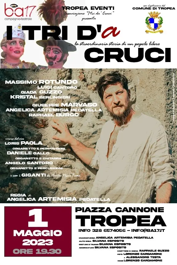 Il 1° maggio alle ore 19:30 in piazza Cannone a Tropea, appena restaurata e di fronte ad uno dei tramonti mozzafiato della costa tirrenica calabrese, andrà in scena l’opera inedita I tri d’a cruci della Compagnia Teatrale BA17, a firma della regista e performer Angelica Artemisia Pedatella, con l’intensa interpretazione di Massimo Rotundo, Luigi Cantoro, Giada Guzzo, Giuseppe Marvaso, Raphael Burgo, Kristal Berlingieri e la stessa Pedatella, accompagnati dalla musica dal vivo dei bravissimi Loris Paola, Daniele Gallo e Angelo Santoro. Tra colpi di scena, sfide musicali e una potente celebrazione di Tropea come Atene, centro di cultura e di diffusione di civiltà nel Mediterraneo, l’opera vede l’intreccio tra danza, musica e recitazione, nel tipico stile BA17 a cui gli artisti hanno abituato il pubblico. La storia riprende uno dei tanti episodi in cui il popolo tropeano ha dimostrato il proprio coraggio nella lotta alla pirateria saracena che dal medioevo in poi, per lunghi secoli, ha vessato le popolazioni della costa. [Continua in basso]
